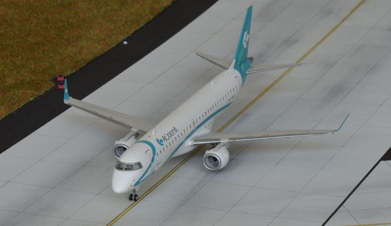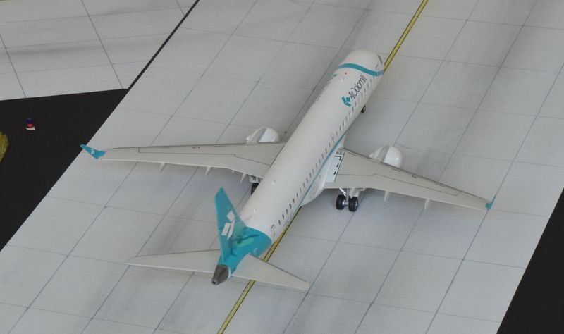 Persönliche Schlussbemerkung: In meinen Augen ein schönes, kleines Modell. Die Form des Flugzeuges ist optisch gut getroffen. Der Zusammenbau problemlos, die Decals bis auf das Cockpit spitze. Man darf gespannt sein, mit welchen Airlines dieser Bausatz noch zu haben sein wird, und auch, ob an den Gerüchten etwas dran ist, dass Revell uns auch mit der E190 erfreut. Ein etwas kürzerer Rumpf kann ja nicht so schwer sein ?!