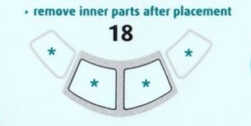 Gespannt war ich bei Decal Nr. 18, dem Cockpit. Hier soll man die inneren Flächen des Decals nach dem anbringen entfernen. Um den Modellbauer "zu zwingen" das zu tun, hat man ein Symbol auf die Cockpitscheiben gedruckt. Ich habe es versucht. Es hat nicht funktioniert. Dieses Decal war am Ende Schrott. Tja. Wie befürchtet, eine dumme Idee. Zumindest bei meinem Decalsatz. Also Cockpitstreben per Hand gemalt.
