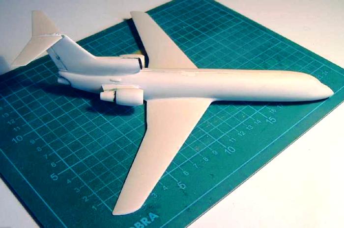Die Teile haben eine klare Form und passen gut zusammen. Der Rumpf ist ein komplettes Teil, welches bereits intern beschwert ist, so dass der Flieger auch auf eigenen Füßen stehen bleibt. Die grobe Form aus Rumpf, Tragflächen und Triebwerken montiert sich leicht, lässt sich gut verspachteln und schleifen. Mit Gravuren wird sich deutlich zurückgehalten, nur auf den Tragflächen gibt es eine Andeutung zu sehen. Sicherlich Maßstabsgerecht, doch eigentlich zu wenig, finde ich. Das Fahrwerk ist rudimentär, hier empfiehlt sich ein Blick in die Restekiste. Das gilt auch für Antennen und sonstige Details. Ich verspachtele Resin-Bausätze gerne mit Autospachtel, das funktioniert prima. Grundiert habe ich das Flugzeug mit der Humbrol-Grundierung in grau, anschließend mit Standardfarben von Revell weiß 04 und eine eigene Graumischung - ich nenne sie Revell 372 - lackiert.