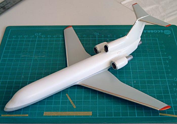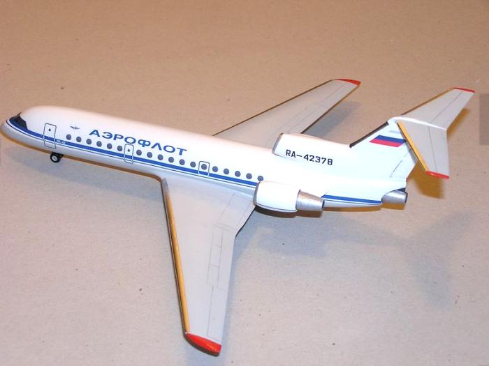 Also zum Flieger. Der wurde in den Siebziger Jahren entwickelt, um die IL-18 und Tu-134 auf kurzen und mittleren Strecken zu ersetzten. Es sollte das erste Flugzeug mit Mantelstromtriebwerken in der SU werden. Die Auslegung mit drei am Heck angebrachten Triebwerken, ähnlich der Boeing B727 und der HS121 Trident und natürlich ihrem kleinen Vorgänger, der Yak-40, war schon damals eigentlich überholt und erwies sich bei der Konstruktion dann auch als mehr als tückisch.