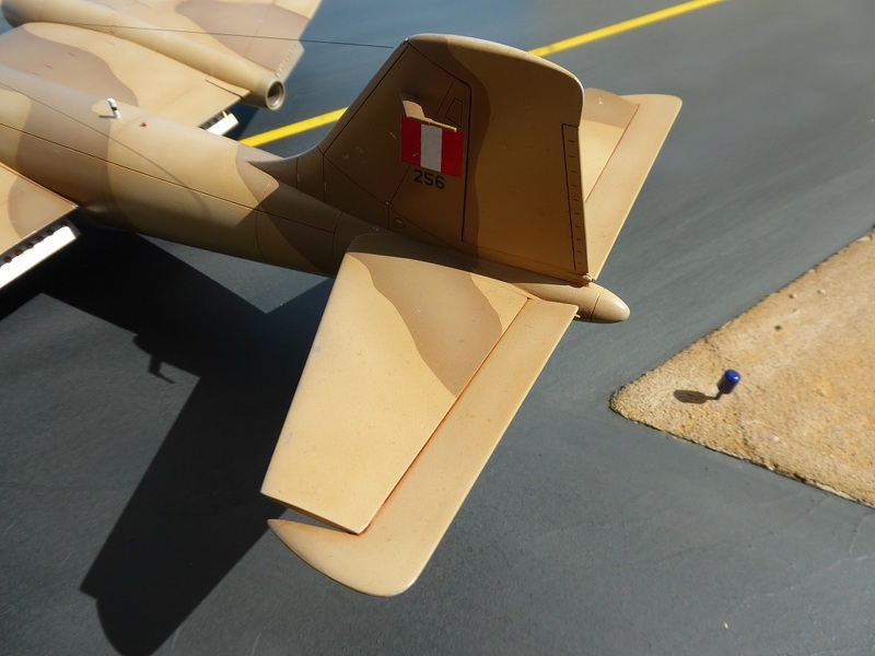 Die mit Abstand schwierigste Entscheidung war die der Bemalung. Nach (sehr) langer Überlegung entschied ich mich für eine Maschine der peruanischen Luftwaffe mit einem attraktiven Wüsten-Tarnschema. Die Farben Dark Earth und Tan auf der Oberseite wurden "Hart Edge" mit Tamiya-Klebeband aufgetragen. Dann wurden beide Farben durch lange Röllchen aus Pattafix voneinander getrennt und vorsichtig aufgehellt. Somit entsteht zwischen den beiden Farbtönen ein diffuser Schatten. Auf der Unterseite kam ein anderer Effekt zum Einsatz. Nach Auftragen der Farbe Light Aircraft Grey wird mit dem etwas abgedunkelten Grundton an einzelnen Bereichen nochmals leicht überlackiert. Danach entfernt man wieder etwas mit feinem Schleifpapier diesen Farbeffekt. Die Maschine wirkt jetzt etwas verwaschen und abgenutzt.
