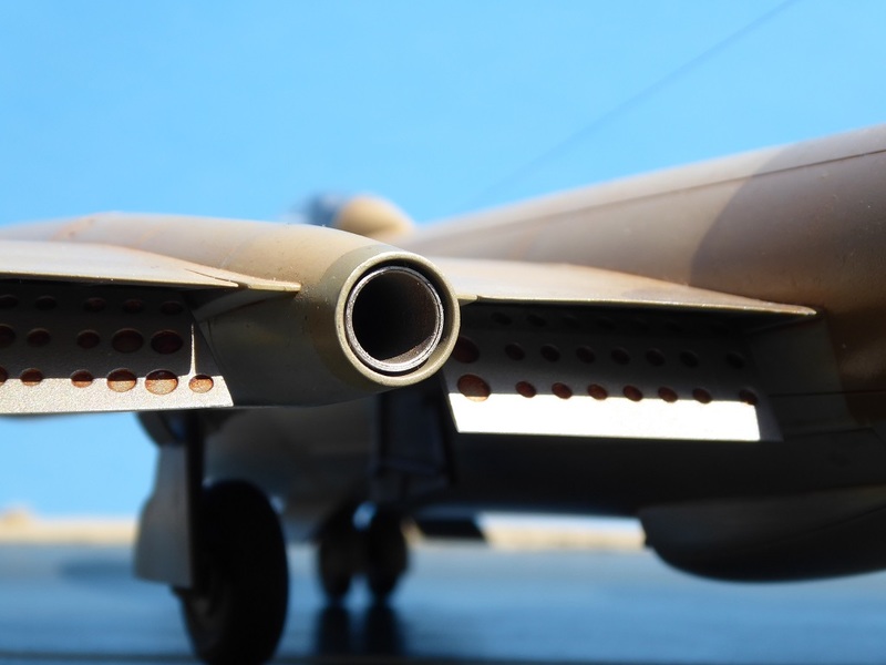 Als Farben verwendete ich Produkte der Firma GSI Creos (Gunze). Nach einer Versiegelung benutzte ich klassische Ölfarbe von Windsor & Newton (Burnt Sienna) für ein großzügiges Washing. Apropos Washing: Beide Triebwerkseinläufe sollten hier auf jeden Fall vor dem Einbau damit bedacht werden. Sie wirken nach dem Lackieren etwas spielzeugartig. Ein wenig schwarze Ölfarbe in die Vertiefungen der Schaufelblätter einmassiert schafft sofort Abhilfe und gaukelt einen die charakteristische Tiefe eines solchen Triebwerks vor. Zum Abschluss noch ein paar Pigmente für Schmauch und Schmutz und eine Versiegelung mit Mattlack.