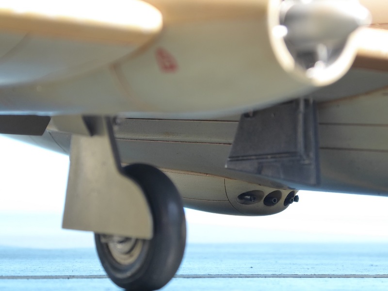 Nach mehreren Fehlschlägen löste ich wieder das Cockpit von der Platte und setzte es allein in die rechte Rumpfhälfte ein. Jetzt war alles an seinem Platz. Nach Schließen des Rumpfes wurde die Platte als letzter Arbeitsschritt mit vielen Anpassungs- und Schleifarbeiten von oben eingeklebt. Sie war der Übeltäter! Außerdem stört das übertriebene Rillenmuster auf dem Seitenruder, welches zugespachtelt werden muss. Zugespachtelt werden müssen auch die Übergänge des "Ventral Gun Pack" zum Rumpf. Dafür wirkt es deutlich filigraner als das Bauteil aus dem Bausatz. Die restliche Montage verlief dann wieder problemlos.