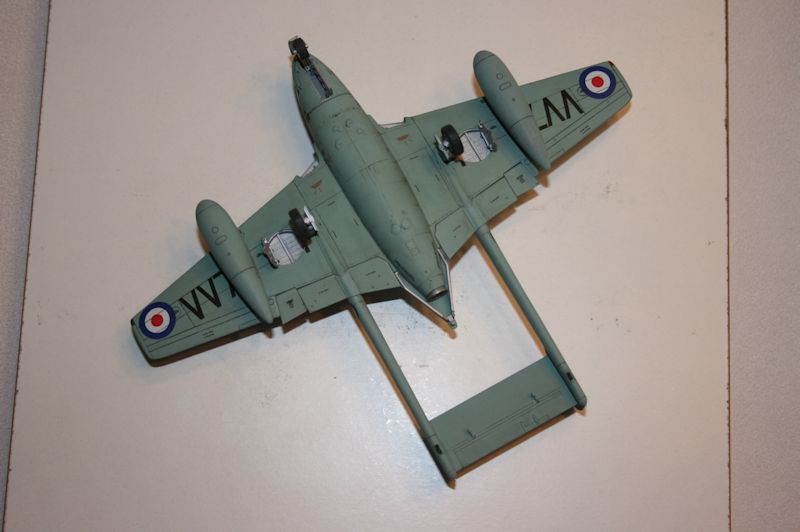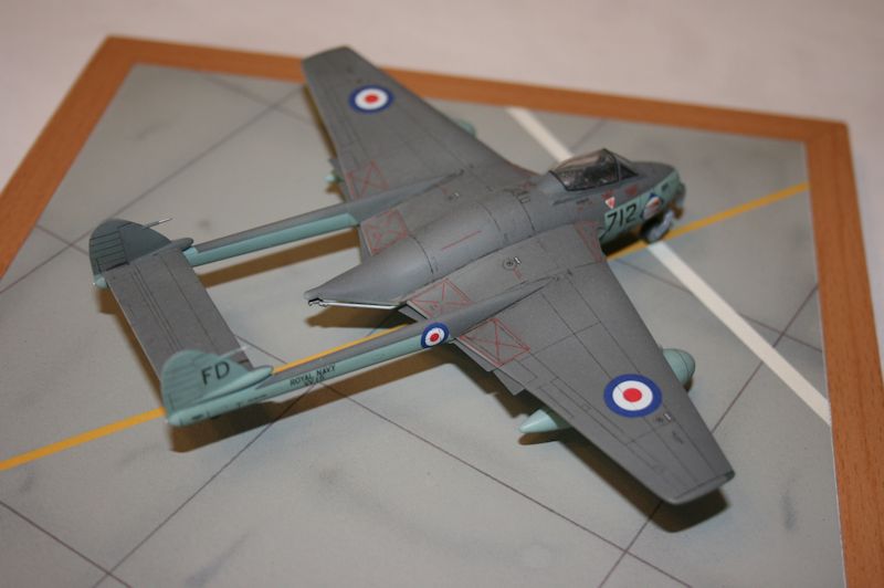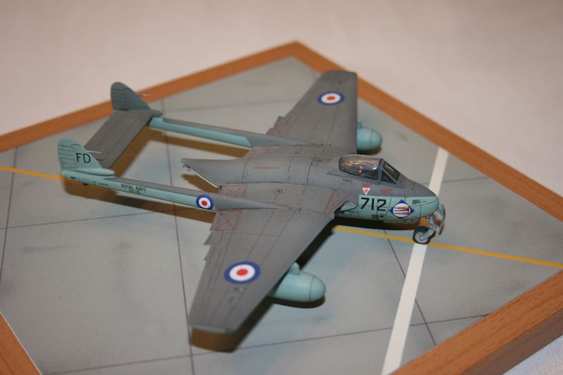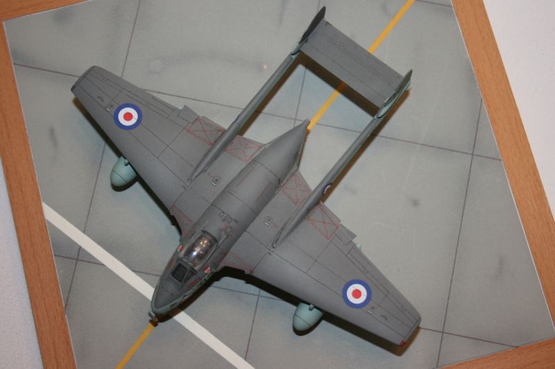 Man kann das Modell in drei Bemalungsvarianten der Royal Navy bauen, die sich aber im Prinzip nur in den Kennungen unterscheiden. Dazu gibt es einen exakt gedruckten Decalbogen (ca. 6 x 6 cm), der sich sehr gut verarbeiten lässt. Leider enthält er nur das Allernotwendigste. Das Stenciling ist praktisch nicht vorhanden. Ich besorgte mir noch einen Vampire T.11 Bogen von Airfix und habe diese, wo sinnvoll, übernommen. So ergibt sich eine deutlich optische Detailaufwertung des Modells. Gealtert wurde mit dark wash von MIG.