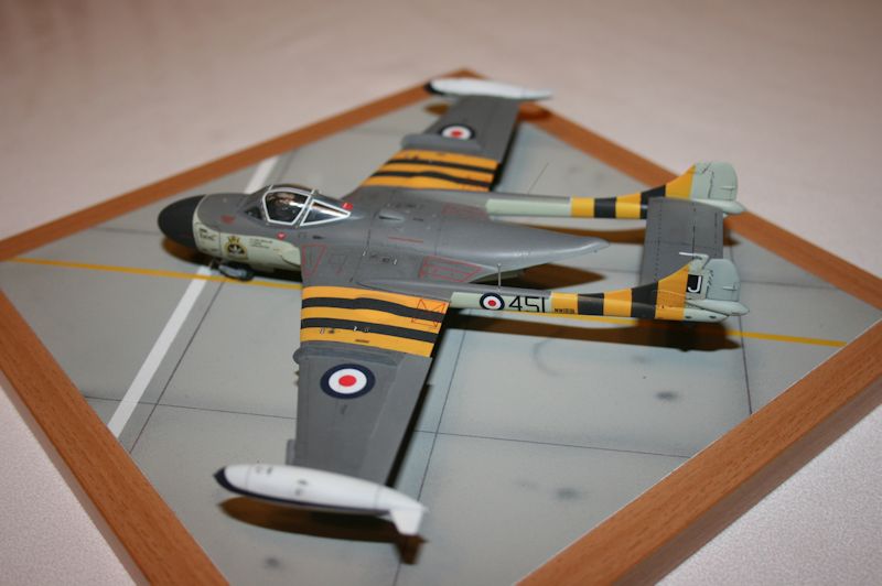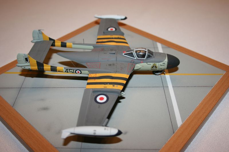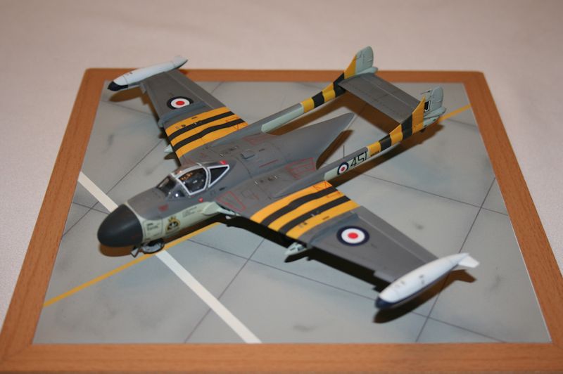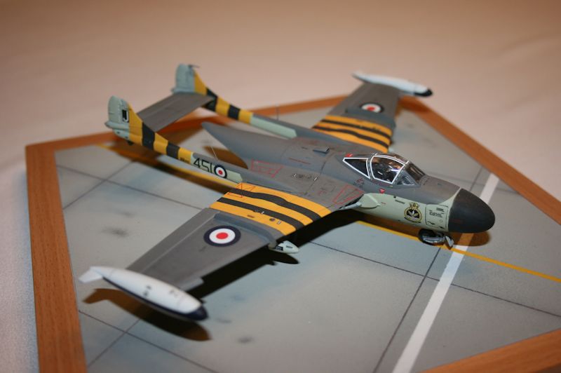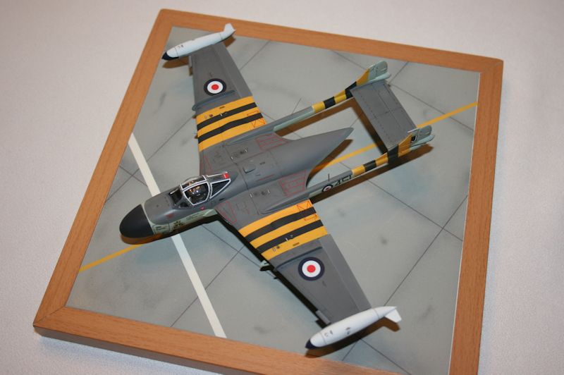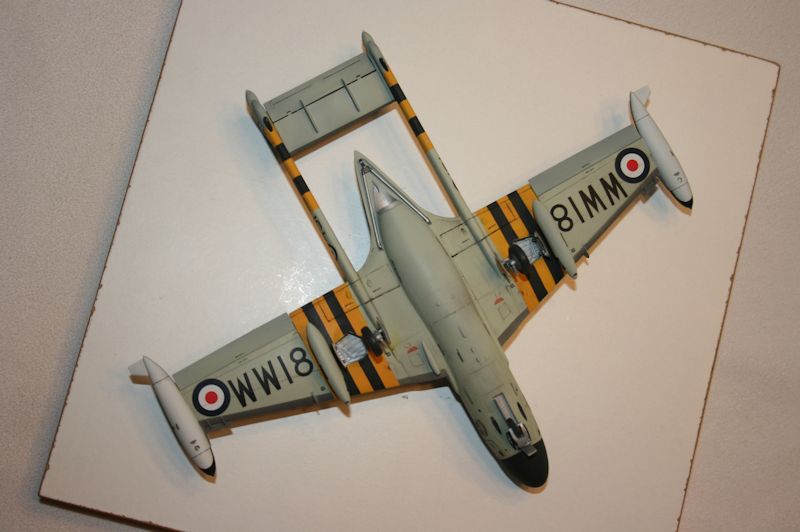 Man kann das Modell in zwei Bemalungsvarianten der Royal Navy bauen, die sich aber im Prinzip nur in den Kennungen unterscheiden. Ich nahm die für den Suezeinsatz von 1956, mit den gelb-schwarzen Streifen. Es gibt dazu die Abziehbilder, welche aber an den Rumpfholmen innen falsch konzipiert sind und deshalb überhaupt nicht passen. Der gedruckte Gelbton ist auch falsch. Ich habe diese Streifen deshalb komplett gespritzt. Sonst ist der exakt gedruckte Decalbogen sehr gut. Die Abziehbilder lassen sich sehr gut verarbeiten. Leider enthält der Bogen nur das Allernotwendigste an Stencils. Ich besorgte mir daher noch einen Vampire T.11 Bogen von AIRFIX und habe diese, wo sinnvoll, übernommen. So ergibt sich eine deutlich optische Detailaufwertung des Modells.