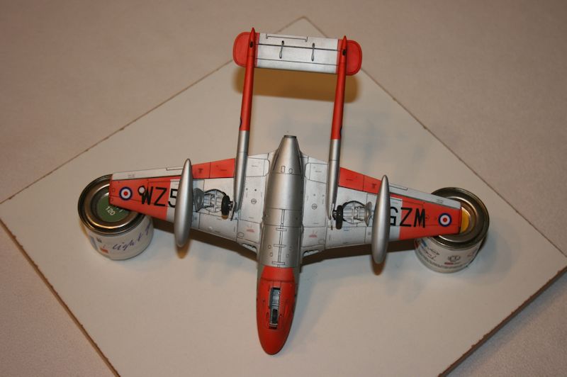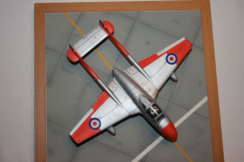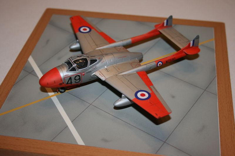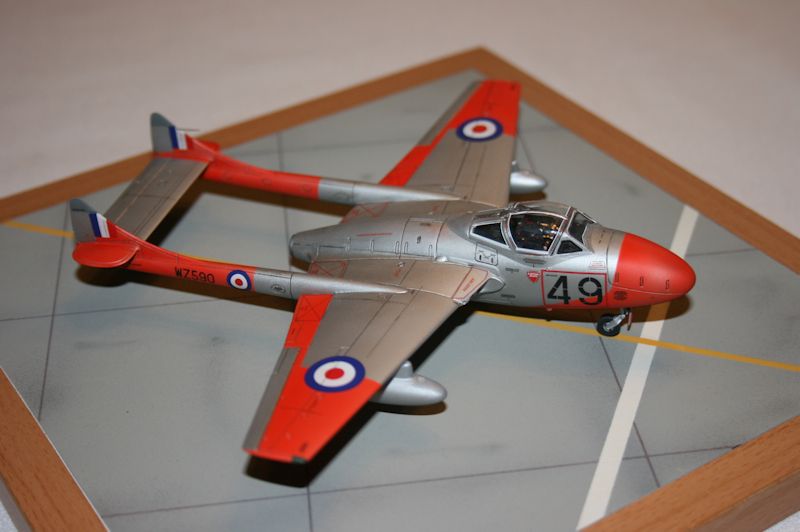 Vorbild: Die D.H. 100 entstand ab 1941 speziell für das Goblin Strahltriebwerk. Der erste Prototyp flog am 20. September 1943. Bei ihrem Erscheinen war die Vampire der schnellste britische Jäger. Ab 1946 flog die F Mk. 1 bei den Einsatzverbänden der RAF bis sie Anfang der 1950er Jahre außer Dienst ging. Dem Jagdbomber FB. Mk. 5 von 1948 folgte der zweimotorige Nachtjäger DH. 113. Man verband den Rumpf des Jabo mit einem Cockpit im Stil der Mosquito-Nachtjägers. Auf Basis dieser Version entstand 1950 als private Entwicklung der doppelsitzige Trainer TMk. 11. Bis 1967 nutzte die RAF diesen frühen Trainer. Von über 600 Exemplaren wurden natürlich auch einige an andere ausländische Nutzer der Vampire exportiert.