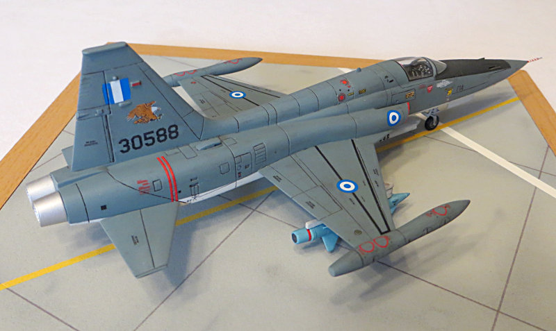 Ich habe das Flugzeug der griechischen Luftwaffe (Polemiki Aeroporia) mit Flächenendtanks bestückt. Unter dem Rumpf habe ich einen kombinierten Bomben-, Raketencontainer des Typs SUU-20 Dispenser montiert (Flugzeugwaffenset No. III von HASEGWA). Unter den Tragflächen wurden je Seite eine Luft - Boden Rakete des Typs AGM-12 Bullpub(entnommen dem Bausatz der TRUMPETER F-105) an Pylons mit zusätzlichen Raketenschienen angeordnet. Die Pylons stammen aus dem Bausatz. Die Raketenschienen habe ich aus EVEERGREEN Sheet selbst angefertigt.