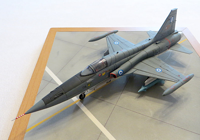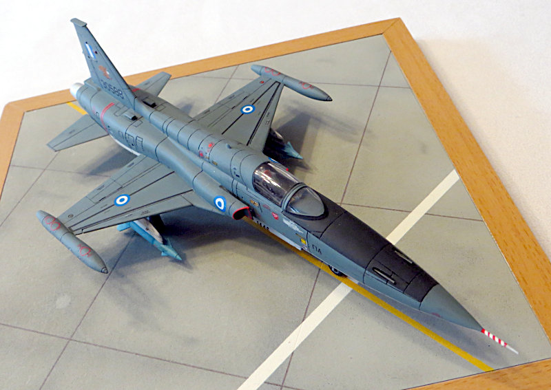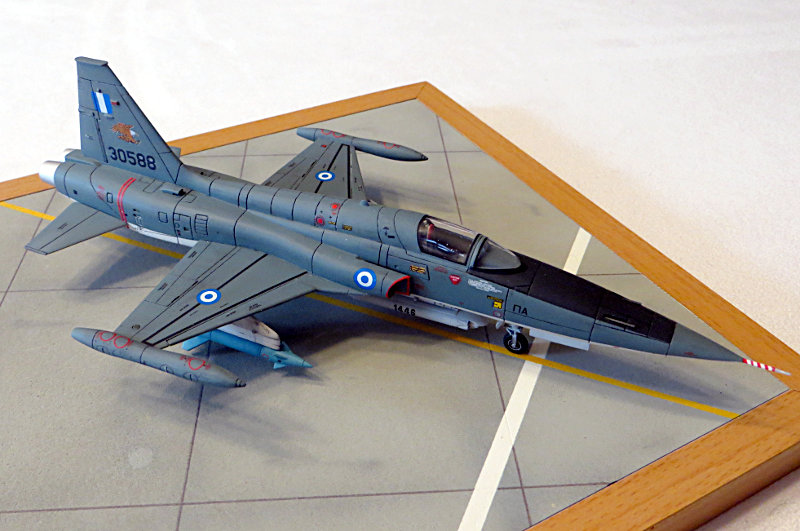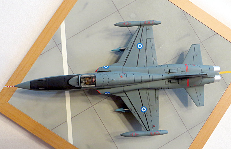 Es liegt ein umfangreicher Decalbogen bei, welcher qualitätsmäßig aber nur mittelmäßig ist. Die Standart decals verwendete ich aus einem decalbogen der F-5B von REVELL, welcher von besserer Qualität ist. Die griechischen Roundels und Flaggen stammen von einem decalbogen von Carpena. Die Adler stammen von SIAM decals aus Thailand.