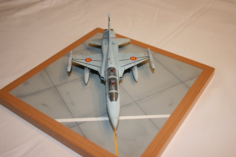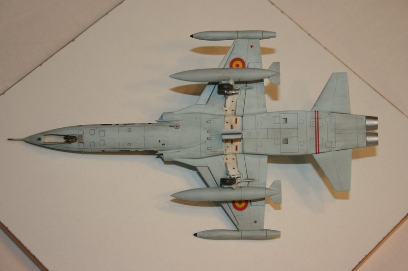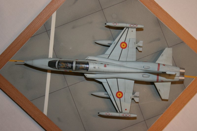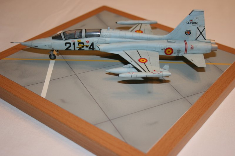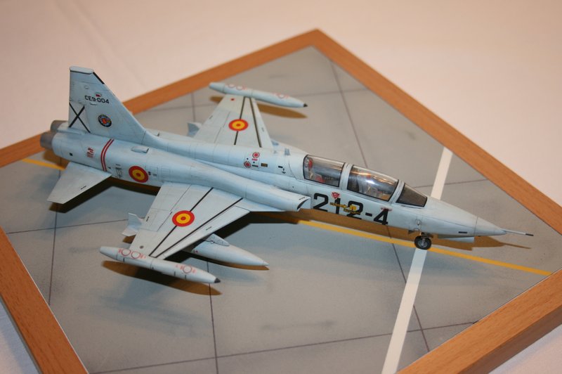 Das Flugzeug F-5B ist dennoch unbewaffnet! Der eigentliche Trainer wurde in der Regel in Spanien nur mit Flächenendtanks, oder mit zusätzlichem Tank unter dem Rumpf, selten mit Tanks unter den Tragflächen, wie hier im Modell dargestellt, geflogen.