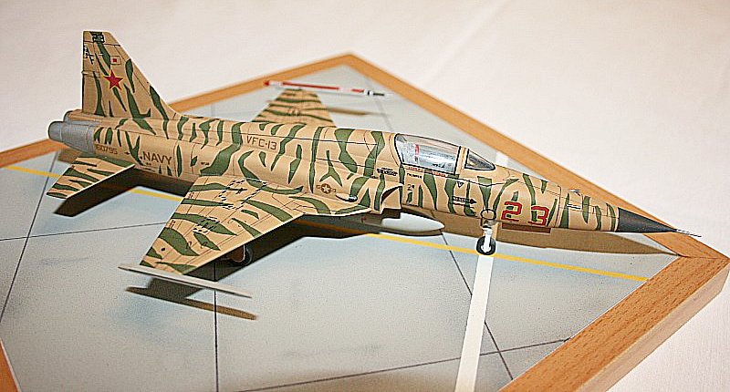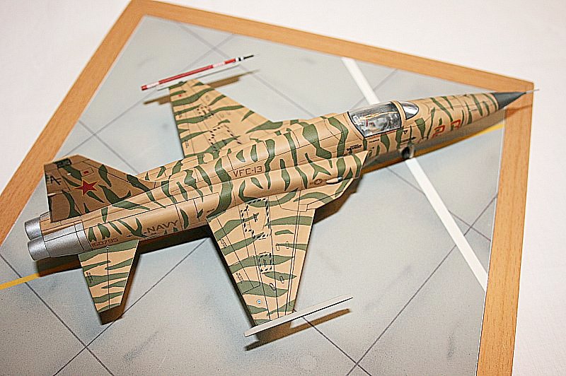 Bei dem hier gebauten Flugzeug handelt es sich um ein Exemplar der US Navy. Wie bekannt, tragen diese so genanten Feindflugzeuge sowjetische Tarnbemalungen und auch russische Kennungen sowie rote Sterne. In letzter Zeit haben die Amerikaner den Feind neu definiert. So tragen neuere Aggressorstaffelmaschinen die Hoheitsabzeichen der nordkoreanischen Luftwaffe.