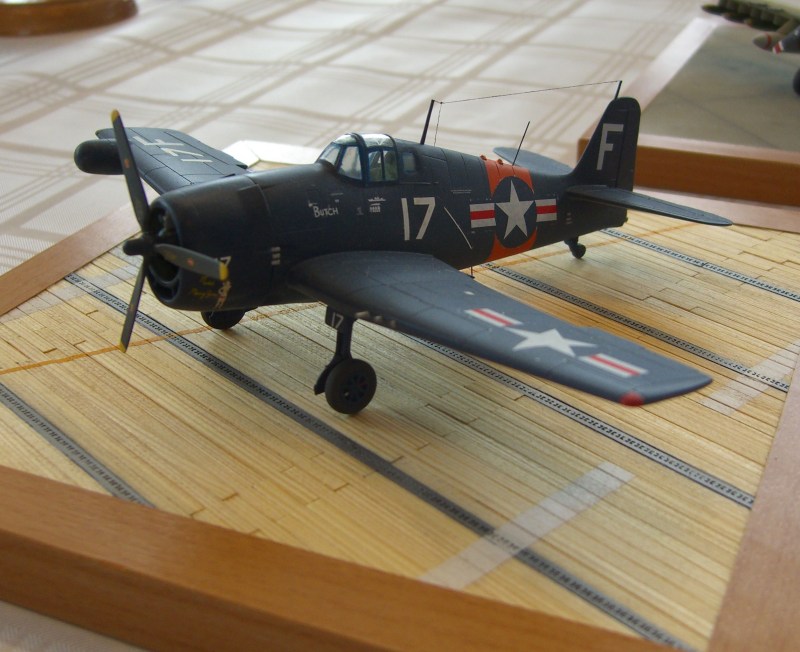 Bleibt noch zu erwähnen, daß man den Anstellwinkel der Hauptfahrwerkstreben nach Risszeichnung korrigieren sollte. Den Fanghaken sollte man auch neu anfertigen. Die Kanonen habe ich aus Kanülen hergestellt. 2009 soll von Eduard eine 72er Hellcat herauskommen (?). Bleibt abzuwarten, wann und ob das wirklich geschieht und ob der Revell - Bausatz, zu welchem Preis, hier noch getoppt wird...