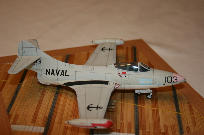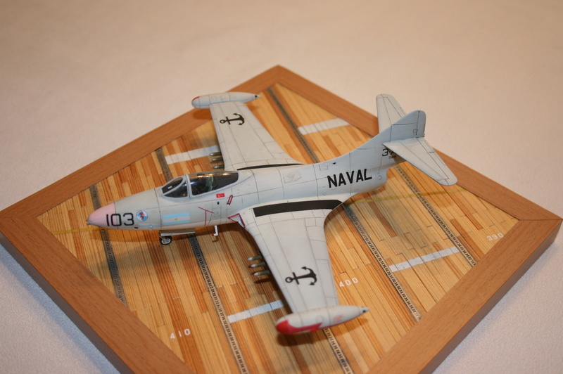 Die Grumman F9F "Panther" ging auf einen Entwurf zurück, den Grumman im Jahr 1946 dem Bureau of Aeronautics vorgelegt hatte. Im September 1946 wurden drei Prototypen bestellt, die das britische Strahltriebwerk Rolls-Royce Nene erhalten sollten. Der Erstflug der "Panther" fand am 24. November 1947 statt. Im Februar 1948 bekamen die Prototypen Zusatztanks an den Flächenenden, die später zum Standard wurden. Im Oktober 1948 wurde eine Erprobung der Trägertauglichkeit durchgeführt. Ab Mai 1949 wurde diese Maschine in Serie gefertigt. Dieses Flugzeug war der meistgeflogene Marinejäger im Koreakrieg. Nach der Ausmusterung wurden einige Maschinen in den USA zu Zieldrohnen umgebaut." (Zitat: WIKIPEDIA) Eine Anzahl "Panther und "Cougar" gingen an die Argentinische Marine.
