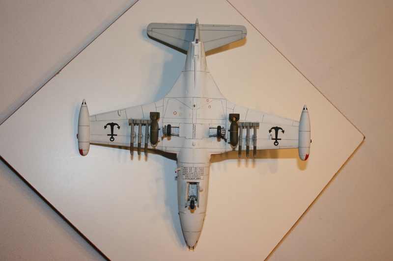 Vorher muss man sich auch noch überlegen, ob oder welche Waffen man unter den Tragflächen mitführen will, also welche der Bohrungen / Aussparungen erforderlich sind und geöffnet werden müssen. Es gibt 6 schöne, so genante 5-inch (12,7 cm) Luft-Boden Raketen mit den entsprechenden sechs Aufhängungen, sowie 6 kleinere Bomben (150 kg) und 2 größere Bomben (254 kg).