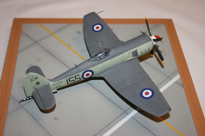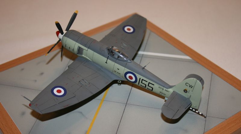 Farbgebung: Die Enamel Farben sind eine Mischung aus Revell und Humbrol. Für die Lackierung der Kabine sind die Maskierfolien von EDUARD (CX 199) sehr zu empfehlen. Man kann das Modell aus dem Kasten als Royal Navy Maschine in zwei Bemalungsvarianten bauen, darunter eine aus dem Koreakrieg. Ich entschied mich anders. Dazu verwendete ich einen Bogen von X-tra decal (X72074), bei dem folgende Varianten zu finden sind: 1 x Royal Navy, je 2 x kanadische, neuseeländische, holländische und australische Marine. Ich entschied mich für die WZ 632, des 804. NAS, FAA, ca. 1953 - 54. Die Kokarden und Kennungen sind exakt ausgeführt und lassen sich gut verarbeiten. Leider enthält dieser Bogen fast kein Wartungshinweise. Abhilfe kam aber von einem ganz frühen polnischen TECHMOD Decalbogen (72006), den ich um 1990 erworben hatte und der seitdem in einer Kiste lagerte. Nach fast 30 Jahren, ließen sich diese Abziehbilder immer noch sehr gut verarbeiten! Nach Fotos im Internet habe ich den Propeller ebenfalls mit Hinweisen versehen. Die Decals stellte ich mir aus verschiedenen Quellen zusammen, pro Propellerblatt insgesamt fünf Stück! Gealtert wurde wieder mit DARK WASH von MIG.