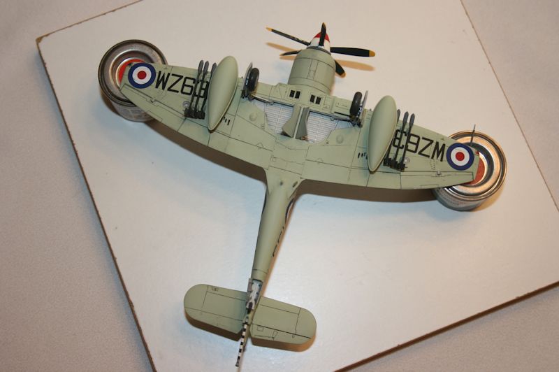 Die Fahrwerksteile passen gut. Sie sind sehr filigran ausgeführt. Die Raketen sind auch super. Ihre Lackierung: Aufhängung Tragflächenunterseitenfarbe, Rakete Anthrazit, Raketenkopf Dark Sea Grey, erfordert etwas Aufwand. Die Tanks sind aus zwei Teilen zu verkleben und passen gut. Zur Befestigung sind recht große Stifte vorhanden. Für die Rumpfoberseite fertigte ich noch aus Albion Alloys Material und Messingdraht ein Antennenteil an, welches im Bausatz fehlt. Ein ähnliches Teil fertigte ich als Pitotrohr für die Tragfläche.