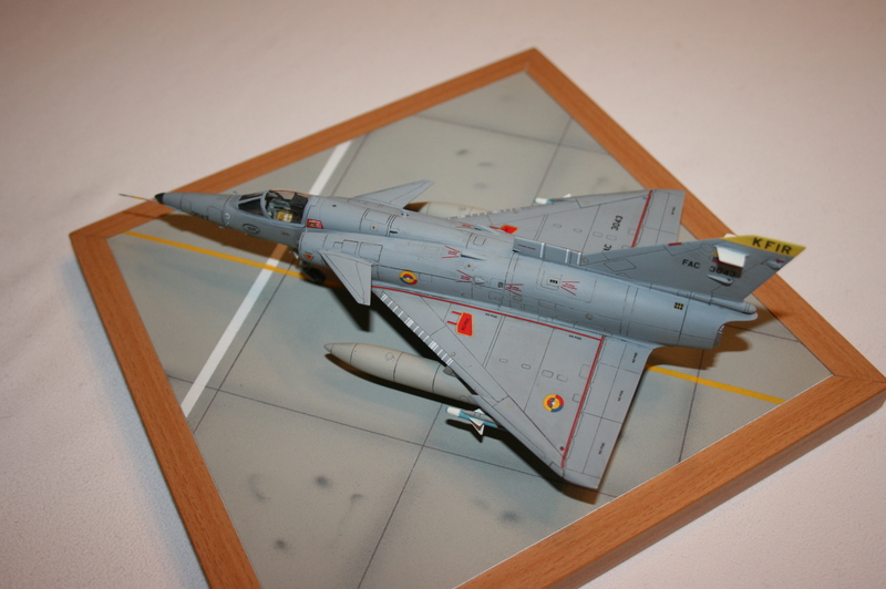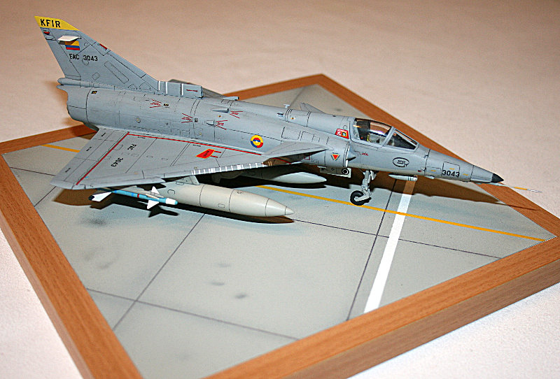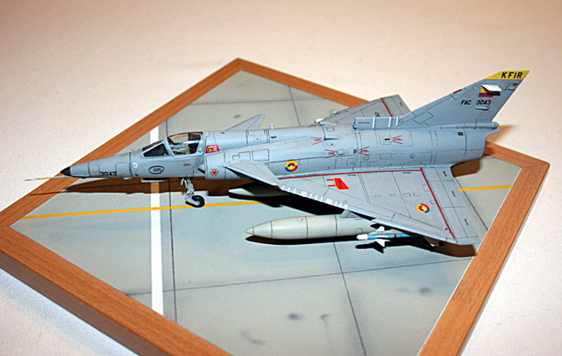 Bausatz: Bei dem AMK-Modellbausatz handelt es sich um einen neueren Bausatz. Er zeichnet sich durch versenkte Gravuren und sehr gute Passgenauigkeit aus. Für Außenlasten gibt es im Bausatz viele Möglichkeiten: 3 Reservetanks können angeordnet werden. Darüber hinaus Luft-Luft Raketen des israelischen Typs "Python 3", diverse Bomben, sowie Luft-Boden Raketen des Typs AGM-12 Bullpub. Man kann die Versionen C.2 und C.7 bauen. Für beide Varianten gibt es unterschiedliche Anbauteile für den Rumpf. Selbst die unterschiedlichen Schleudersitze sind vorhanden. Es liegt ein umfangreicher Decalbogen bei, welcher sich sehr gut verarbeitenlässt. Er gestattet die Darstellung zweier israelischer Maschinen, sowie je ein Flugzeug von Kolumbien und Ekuador. Darüber hinaus liegt eine zivile private US-Kennung bei.