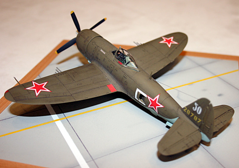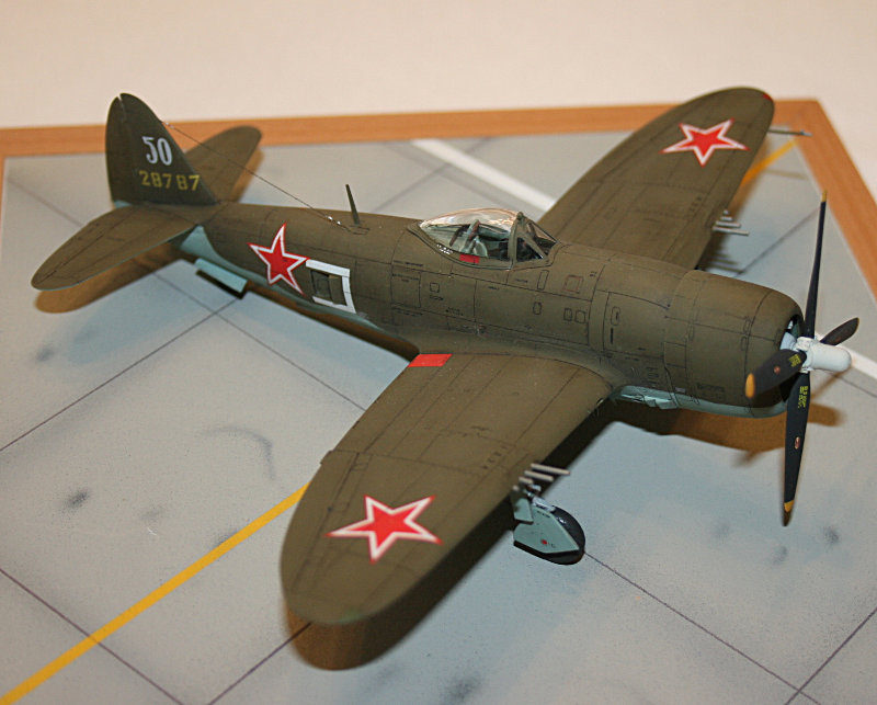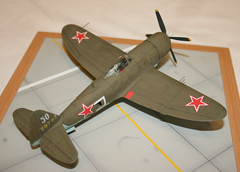 Ich strebte beim Bau dieses Modells, zu meinen anderen P-47 Modellen, eine gewisse Bauabweichung an. Nicht nur deshalb habe ich auf den Anbau der Tragflächenunterflügelstationen verzichtet, welche beim in der Sowjetunion eingesetzten Original auch nicht immer vorhanden, bzw. demontiert waren.
