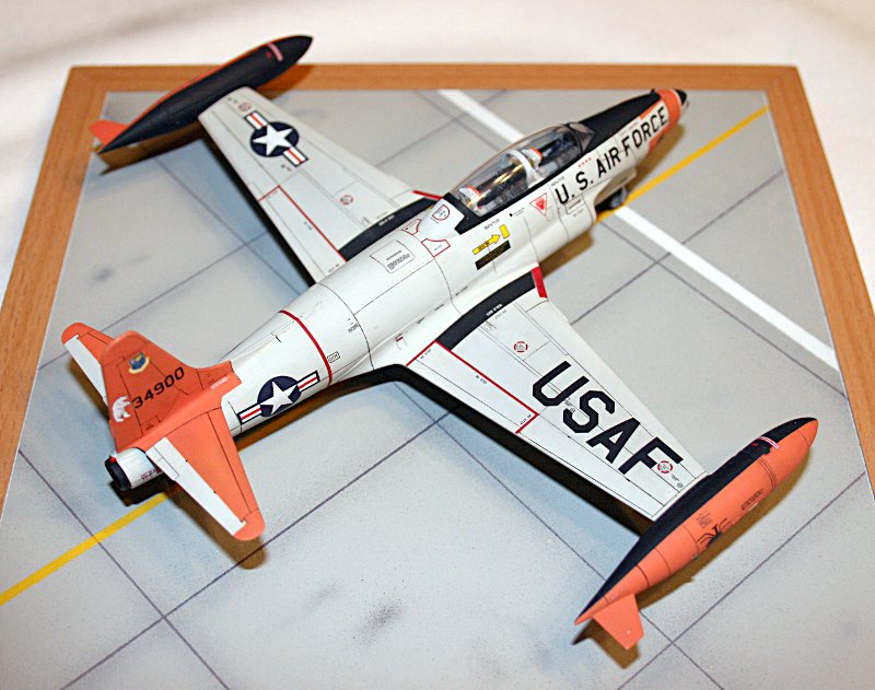 Die US-Hoheitsabzeichen und Kennungen verwendete ich aus dem "dozen set" - Heft aus Tschechien. Dieses Heft gibt es jeweils mit decals in 1/72 und in 1/48. Die decals sind sehr exakt gedruckt und lassen sich sehr gut verarbeiten. In dem Zusammenhang habe ich mir die Mühe gemacht und die Buchstaben für USAF ausgeschnitten. So wird an dieser Stelle die Trägerfolie minimiert...