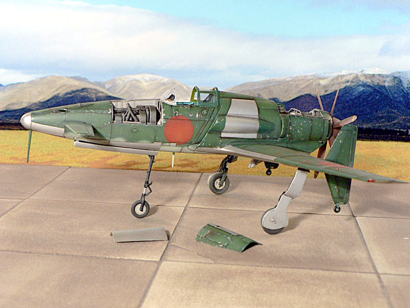 Vor dem Lackieren des Modells in seine Tarnfarben wurde die gesamte Oberfläche mit Aluminiumfarbe versehen. Hierfür habe ich Revell Aqua Color (90 Silber) verwendet . Das erlaubte mir später Chipping-Effekte mit Masking Sol (Gummi Maske) zu erreichen und einige Flächen in Naturmetall zu lassen wie auf einigen Original Fotos zu sehen ist. Für die grüne Tarnung habe ich Tamiya XF -70 Dark Green 2 (IJN) verwendet und für die untere Flächen XF -12 JN Grau, natürlich mit Pre-Shading und Farbmodulation.