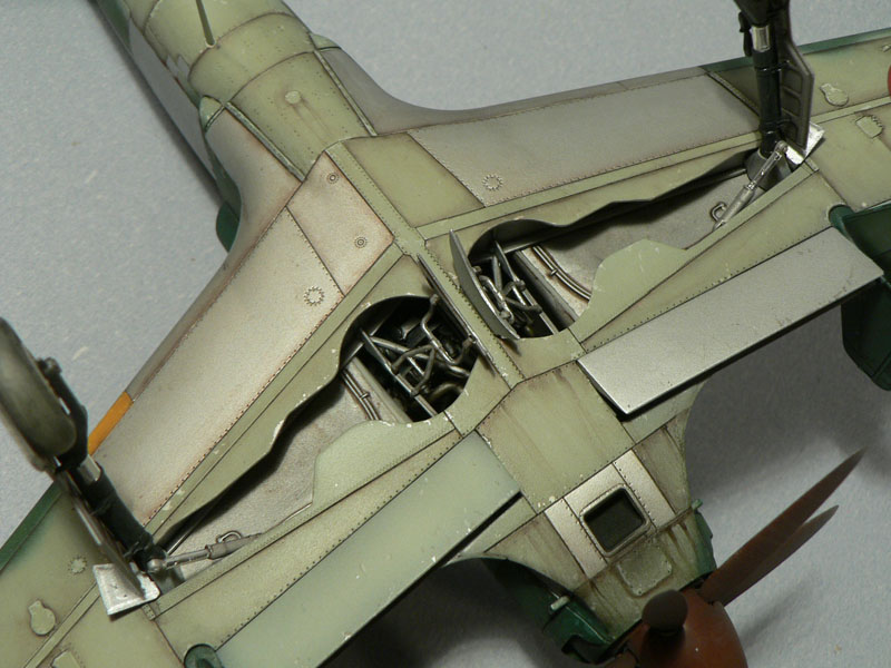 Die Markierungen wurden mit Masken gemacht (Hinomarus) und die Wartungs- und Warnhinweise sind Abziehbilder des Bausatzes die über zwei Schichten Klir (französisch Version von Future) aufgebracht wurden. Die Strukturlinien habe ich mit Tamiya Panel-Line Accent Colors (Dunkelbraun und Schwarz) ergänzt. Verwitterung wurde mit Mikro-Malerei (etwas hellere Farben mit einem 00 Pinsel aufgetragen) und Verläufe (Faber-Castell Pitt Stift) über eine matte Oberfläche (Gunze H20) erreicht.