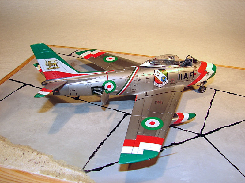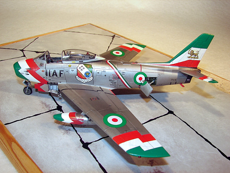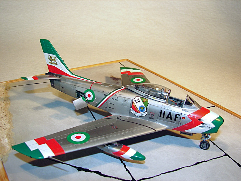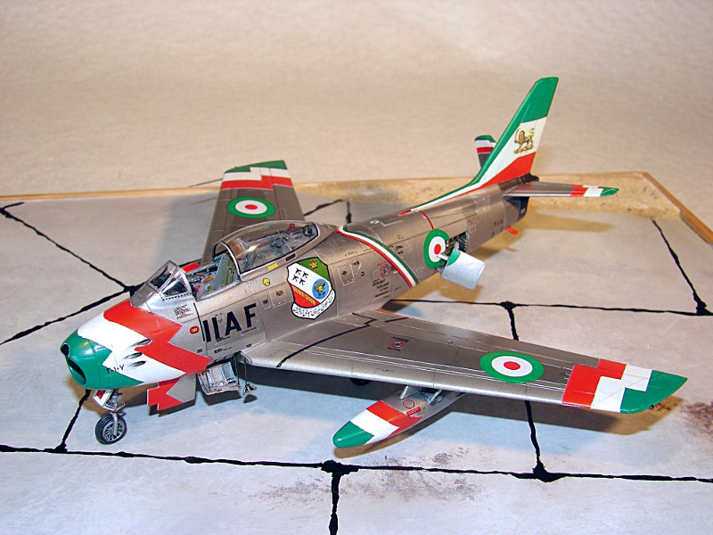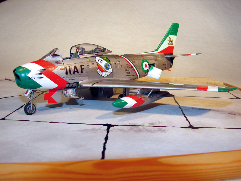 Das Modell entstammt dem 1/72er Fujimi-Bausatz und zeigt eine F-86F des ehemaligen IIAF Kunsflugteams "Golden Crown". Die Kennzeichen sind größtenteils auf dem eigenen Drucker entstanden, wobei ein Spezialist auf diesem Gebiet (der Herausgeber des Magazins "Iranian Aviation Review") die maßgebliche Hilfe bei er Erstellung der einzelnen Objekte geleistet hat. Die hochinteressante Geschichte dieses Kunstflugteams ist in diesem Magazin übrigens auch gut nachlesbar: iranianaviation.com