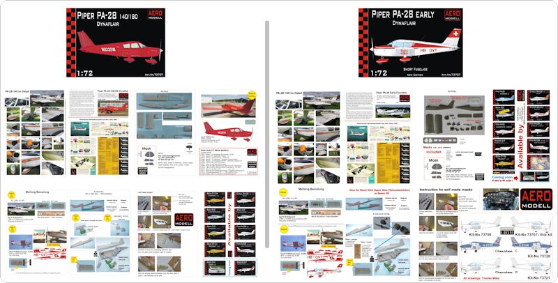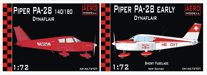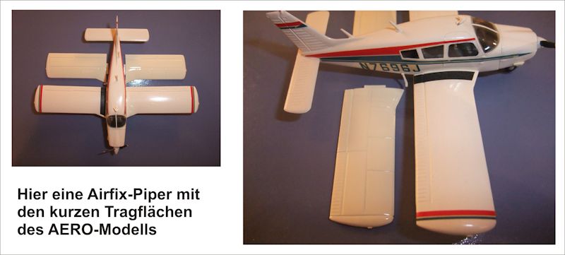 Seit vielen Jahren hat Airfix einen PA-28 Arrow II genannten Typ der Cherokee im Programm. Anmerkung: Modellnamen wurden bei Piper übrigens recht oft geändert und geben nicht immer auch Hinweise auf äußerliche Veränderungen! Bisher genügte dieser Kit wohl den Ansprüchen der Modellbauer. Heute stellen sich die Fragen nach Detail- und Originaltreue allerdings deutlich differenzierter. Und an dieser Stelle werden schnell die Schwächen des Airfix-Kit deutlich, der aber sehr klar in die Reihe R- also retrectable /Einziehfahrwerk eingeordnet werden kann. Bei den jetzt besprochenen AERO-Modell-Kits handelt es sich allerdings um die Ausführung mit festem Fahrwerk, von dem es zunächst grundsätzlich ebenfalls zwei gibt: Dynaflair - also mit verkleideten Radschuhen (serienmäßig), oder ohne diese. Außerdem geht es hier um die PA-28 mit kurzem Rumpf, kurzer Hershey-Bar-Tragfläche und kleinen Steuerflächen.