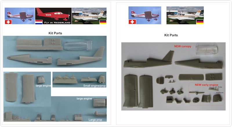Und auch davon gibt es inzwischen bei AERO-Modell zwei Kit-Ausführungen, wie ganz oben gezeigt - übrigens bei gleicher Kit-Nummer!! Der erste Bausatz (nicht besonders fester Stülpkarton - innen andere Cover-Bedruckungen von TOM-Modellbau) enthält alle Teile zum Bau der Versionen Cherokee B, C und D und auch drei Decaloptionen - hier sind dessen Teile links im Bild.