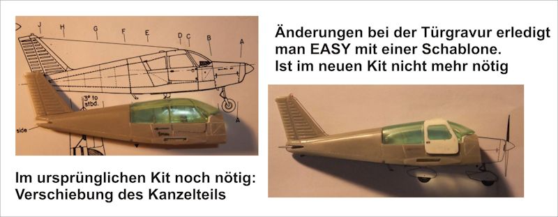 Beim Zusammenbau der Rumpfhälften ist darauf zu achten, dass der Anguss an den Verbindungsstellen am Rumpf so weit entfernt wird, bis die Breite des Rumpfes dem Kabinenteil entspricht (vgl. Skizze in den Bauanleitungen). Um korrekten Sitz zu bekommen, sollte das Kabinenteil der ersten Kit-Version hinten um reichlich 1mm gekürzt werden - aber bitte laufend Anpassungen vornehmen! Durch den hiermit erreichten, leichten Versatz der Frontscheibe nach hinten ergibt sich gleichzeitig eine bessere Passgenauigkeit mit dem Armaturenbrett.