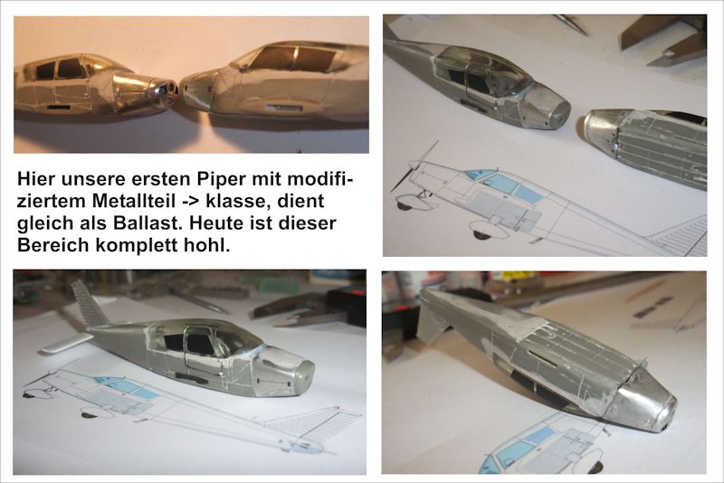 Die Cowling der Cherokee B liegt in den ersten Kits noch als ein Vollgussteil bei. Um ein Umkippen des Modells auf den Sporn (tailsitter) zu verhindern, muss das Teil zunächst ausgefräst werden, damit ein Bleiballast darin Platz findet. Auf dem Zubehörmarkt gibt es von Constanza die Cowling der PA-28 als Vollgussteil in Weißmetall, was einen Bleiballast überflüssig macht. Wirklich eine gute Idee, finden wir, und haben dieses Teil gleich in unser Modell verbaut. Im neueren Kit von AERO-Modell (rechts im Bild) sind diese Teile hohl und dreiteilig ausgeführt, so dass man Ballast auch selbst einbringen kann - ein großer Vorteil, vor allem in Sachen Zeit- und Arbeitsersparnis. Dazu gibt es jetzt im neuen Kit auch noch separate Auspuffrohre.