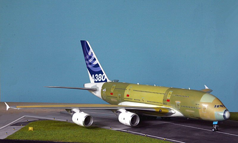 Beim Mischen der Farben bin ich zwar hin und wieder verzweifelt, weil je nach Lichteinfall die Farbe auf dem Original oft sehr anders aussah. Schließlich hatīs einigermaßen gepaßt. Natürlich mußte ich noch einen weiteren A380 kaufen, um das Abziehbild für das Leitwerk zu bekommen. Der wartet jetzt auf eine richtige Airline Bemalung. Und wenn mir die Grundierungsbemalung einmal zu langweilig wird, kann ich ihn ja auch weiter bemalen. Ist dann vielleicht das einzige 144er Modell mit einer naturgetreuen Grundierung, die man dann leider genauso wenig sieht,wie die Inneneinrichtung in so einem Flugzeug.