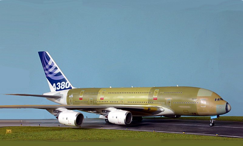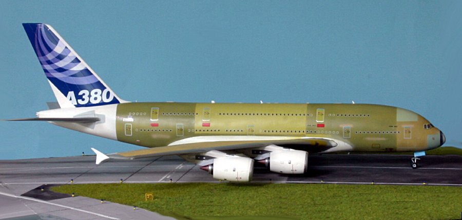 Natürlich mußte ich gleich den A380 haben, als er von Revell erschien. Aber dann kam die große Frage, wie ich ihn bemale. Die alte Werksbemalung hat mir - und anscheinend auch Airbus - nicht gefallen. So lag er da und ich hatte mir vorgenommen, ihn erst fertig zu bauen, wenn eine Airline richtig damit fliegt. Dann kam die neue Bemalung von Airbus und das Interesse wurde wieder etwas belebt. Aber so ganz überzeugt war ich noch nicht von diesem unendlich vielen Weiß. Und dann bekam ich von einem guten Bekannten aus Hamburg eine ganze Bilderserie von dem A380 msn 002, wie er zu seinem ersten Besuch mit Landung in Finkenwerder war. Das war dann der Startschuß! Das war mal ein ganz neuer Anreiz, so einen Vogel in der Grundierungsbemalung zu bauen.
