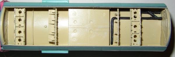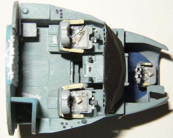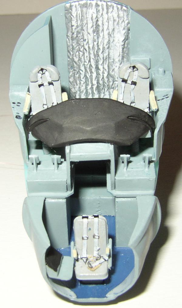 Beim Cockpit benutzte ich als Farbton [B] Humbrol 87. Die Montage erfolgte nicht nach Bauanleitung und prompt gab es Probleme. Kurz die Säge angesetzt und o.g. Satz gemerkt. Nur die Sitzgurte habe ich hinzugefügt. Bei der Montage der Rumpfspitze sollte man sich viel Zeit nehmen und den Kleber austrocknen lassen. Bei Teil 47A bitte einen Blick auf das Deckelbild werfen.