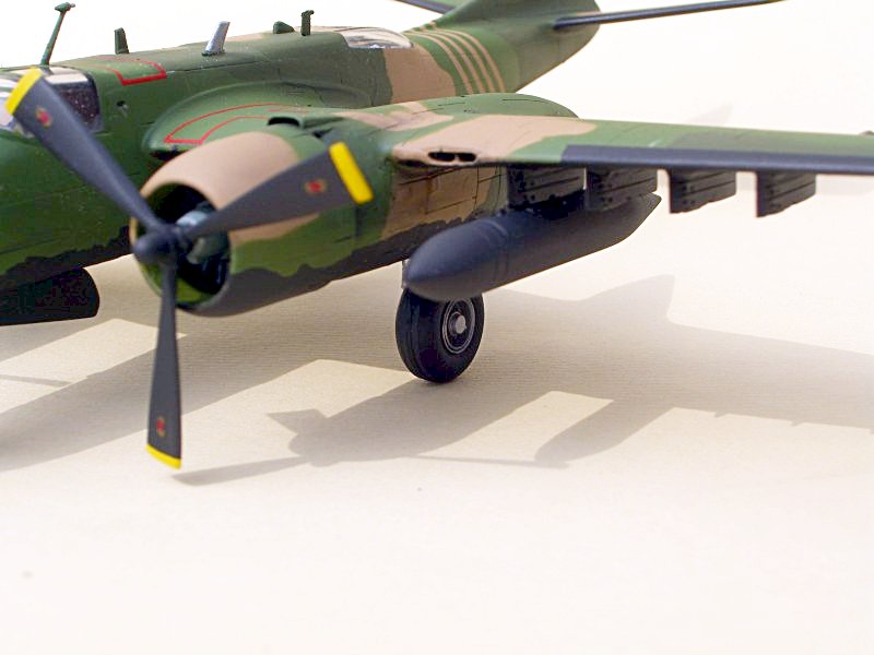 Bei der Counter Invader gibt es aufgrund des massiven Rumpfbugs auch kein Problem mit dessen Unterbringung. Die Bausatz-Räder sind ein wenig abgeplattet. Das R-2800-Triebwerk ist durch einen aufgeprägten Stern dargestellt. Die ganze diesbezügliche Modellkonstruktion hat wenig mit dem Original gemein. Hier kann sich die Zubehörindustrie austoben (Ersatz gibt es inzwischen bei CMK, Pavla und Quickboost). Für die Tragfläche gibt es eine Menge an Bewaffnungen (sind leider nicht immer richtig für den Einsatzort).