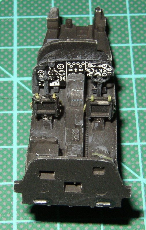 Die Steuerhörner entstanden aus Draht und EVERGREEN-Profile. Für das Instrumentenbrett musste Plastiksheet und ein Decal herhalten. Das gesamte Cockpit war im Original Schwarz. Gurte habe ich noch aus meiner Restekiste ergänzt. Die Mühe mit der Detaillierung des Bombenschachtes habe ich mir erspart, da er bei der Counter Invader nicht benutzt wurde. Die gesamte Bugspitze wurde mit Blei gefüllt (Im Nachhinein zeigte sich, dass es auch unbedingt erforderlich ist). Nachdem die Inneneinrichtung fertig gestellt, die Rumpfinnenseiten schwarz lackiert waren, der vordere Fahrwerksschacht inklusive der Fahrwerksklappen eingeklebt war, wurden die beiden Rumpfhälften zusammengefügt.