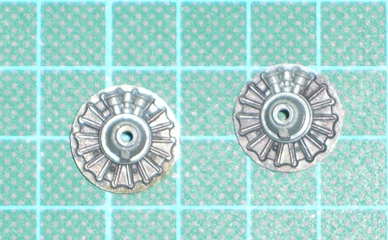 Die Hauptfahrwerksräder sind für eine Counter Invader falsch. Im Original wurden die Räder der KC-135 (!) bei On Mark verbaut. Da ich noch welche von meiner C-135R (von Heller) übrig hatte (dort verbaute ich den True Detail-Räder-Satz), wurden diese gern genommen. Inzwischen gibt es richtigen Ersatz von True Detail für die Counter Invader. Nach dem Bemalen der Räder wurden die Felgen mittels stark verdünnter schwarzer Farbe gespritzt und die Strukturen mittels Trockenmalen deutlich gemacht.