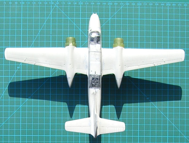 Die mäßig detaillierten Motore habe ich nur vernünftig bemalt. Ich wollte nicht bewusst nicht mehr Geld in den Bausatz investieren. Die im Original verstellbaren Motorklappen hatten im Modell eine Hinterkante von gut einem Millimeter. Also wurde auch hier wieder geschliffen bis die Hinterkante spitz war! Nachdem die restlichen Teile (bis auf die Fahrwerksklappen, das Bugfahrwerk, die Flügellasten und die Räder) nach Bauanleitung verbaut und verspachtelt waren, wurden die Glasteile mit dem vorgestanzten Maskset von eduard abgeklebt. Diese lassen sich wirklich hervorragend verarbeiten und sind generell zu empfehlen. Zuerst wurde die Cockpitinnenfarbe auf getragen und dann folgte ein hellgrauer Farbton. Es folgte das übliche Feinspachteln und dann der schwarze Unterseitenanstrich.