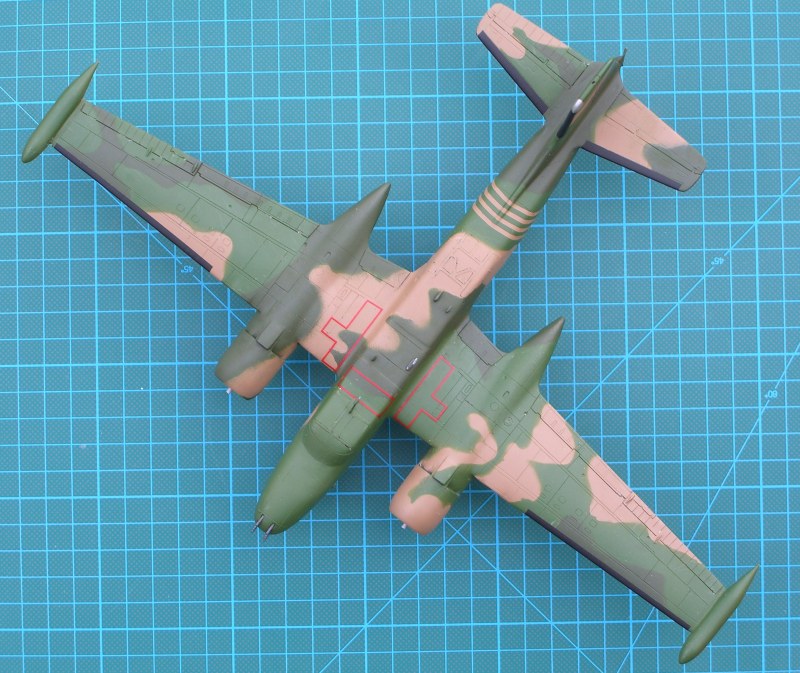 Dabei wurden die Vorderkanten von Tragfläche, Höhen- und Seitenruder gleich mit lackiert. Nach dem Durchtrocknen wurde alles mit Tamiyaklebeband und Maskol vor der nächsten Farbschicht geschützt. Für die Oberseiten benutzte ich die ModelMaster-Farben lt. Bauanleitung. Ich ging hier vom hellen zum dunkleren Farbton vor. Für die Farbgrenzen benutzte ich UHU tac und für die feinen Streifen schnitt ich mir Tamiya-Klebeband passend. Die Zwischenräume füllte ich mit Maskol aus. Bei der Bemalung orientierte ich mich an einer Farbzeichnung des ersten A-26 Invader in action.Der Italeri-Bauanleitung mochte ich nicht vertrauen, denn dort waren alle drei Tarnschemen gleich. In Natur war jedes Flugzeug individuell getarnt.