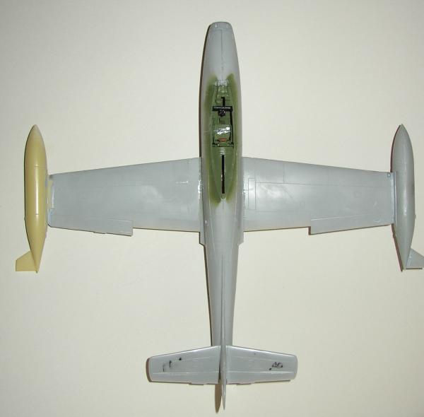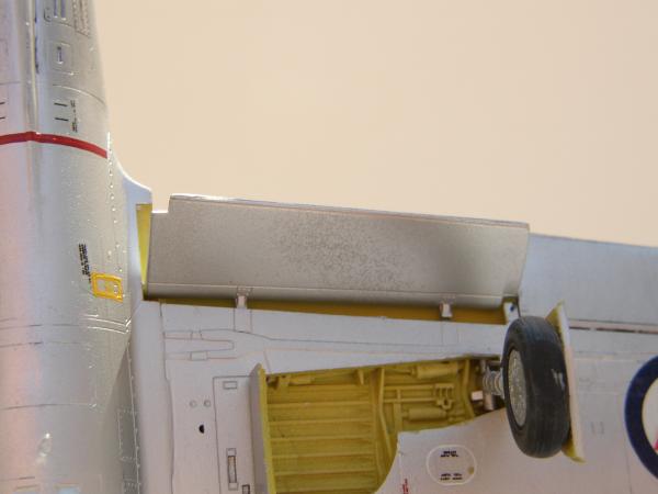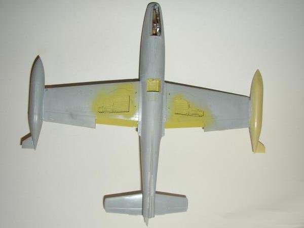 Bei den Fahrwerksschächten und den Luftbremsen verwandte ich H81. Schwierigkeiten ergaben sich beim Anpassen der Fletcher - Tanks. Diese Hürde wurde auch überwunden. Die Lackierung begann mit der Strebeninnenfarbe der Kanzel (Vorher mit eduard - Mask abgeklebt.). Es folgte dann die graue Farbe der Schiebehaube. Das wurde auch maskiert und anschließend das dreifarbige Seitenruder und der weiße Lufteinlauf gespritzt und abgeklebt.