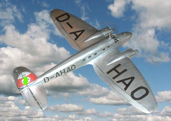 Bei meiner He 111 V 4 blieben die Spinner ebenfalls Silber. Die Teile B 33 entfallen. Sie waren bei keiner frühen Variante der He 111 vorhanden, sondern tauchten erst bei der He 111 F auf. Teil B 42 (Staurohr) ließ ich ebenfalls weg und fertigte es nach den Fotos aus gezogenen Gießästen neu an. Dafür bekam die Rumpfspitze eine Bohrung für die Kabinenbelüftung. Ich setzte eine Kanüle ein. Dann folgte eine Grundierung mit Humbrol 11 (Silber) und in der Folge die Lackierung mit Model Master Metalizer Aluminium. Anschließend wurde die Maschine poliert und einige Schattierungen dabei eingearbeitet. Mittels Model Master Versiegelung wurde die Farbe versiegelt. Die D - Kennung entstand in Eigenanfertigung mittels Decalpapier und Kopierer. Für die schwarzen Akzente der normalen Lufthansabemalung hatte ich keine Lust und da die frühe V 4 sie nicht hatte, ließ ich sie vorbildgerecht weg.
