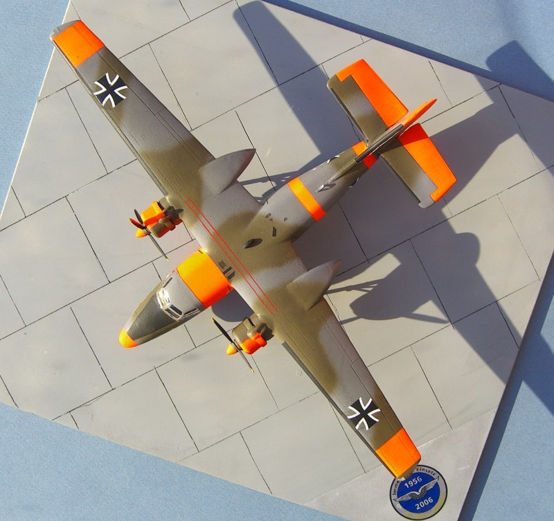 Nach dem das Flugzeug mehrmals gespachtelt und überschliffen war, maskierte ich die Klarsichteile mit Tamiyaklebeband. Für die Seitenfenster nutzte ich eine Lochzange zum Anfertigen der Masken, die dann aus vier Teilen (davon zwei Kreise) bestanden. Nachdem grundiert und noch mal mit Nassschleifpapier geschliffen worden war, erfolgte die Bemalung mit Xtracolor RAL-Tönen lt. F-40. Die Decals wurden anschließend aufgebracht und mit Daco grün (Decalweichmacher) behandelt. Es folgte die Versiegelung mit Humbrol seidenmatten Klarlack. Zum Schluss wurden die Fahrwerke und Kleinteile montiert und dann folgte die Überraschung. Meine Pembroke stand nicht. Da ich eine kleine Base vorbereitet hatte, wurde sie dort einfach aufgeklebt.