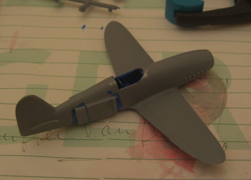 Bau: Das Modell entstand aus der Kiste ohne weiteres Zubehör. Der Bau begann mit dem Cockpit. Ergänzt wurde ein Steuerknüppel. Die Sitzgurte hatte ich mir gespart, denn für japanische Vorbilder hatte ich keine. Das Cockpit ist recht eng und somit sieht man hinterher nicht viel. Grundiert wurde innen mit Revell Silber 90 und darüber kam ein klares Blau von Revell 752.