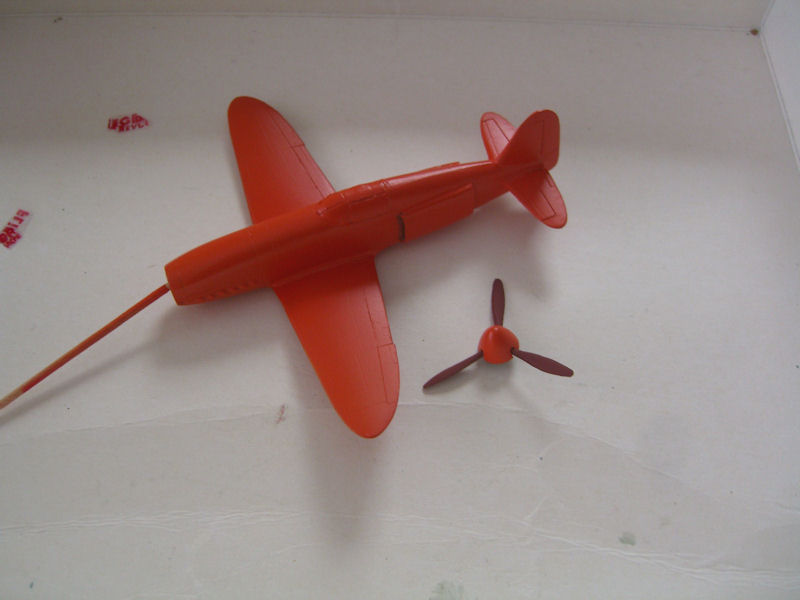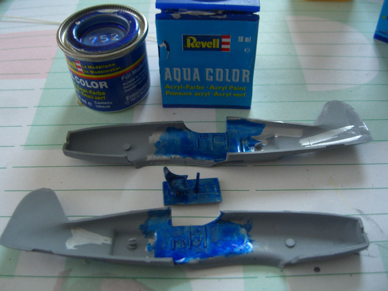 Nachdem ich die Kanzel mit Revell Contacta Clear aufgeklebt hatte wurde sie mit Tamiya Maskierband maskiert. Mittels eines scharfen Skalpells wurden die Streben herausgeschnitten. Der Farbauftrag begann mit dem klarem Blau bei der Kanzel. Dann versuchte ich mich mit der neuen Revell-Grundierung und griff dann doch zu einem mit dem recht neuen Aqua Color Mix verdünnten Grau 57. Nachdem alles durchgetrocknet war folgte ein mattes Gelb. Da ich kein passendes Orange hatte mischte ich mir aus zwei Aqua Color-Farben den gewünschten Farbton. Mit diesem wurde die ganze Maschine inklusive der Fahrwerksklappen und des Spinners lackiert.