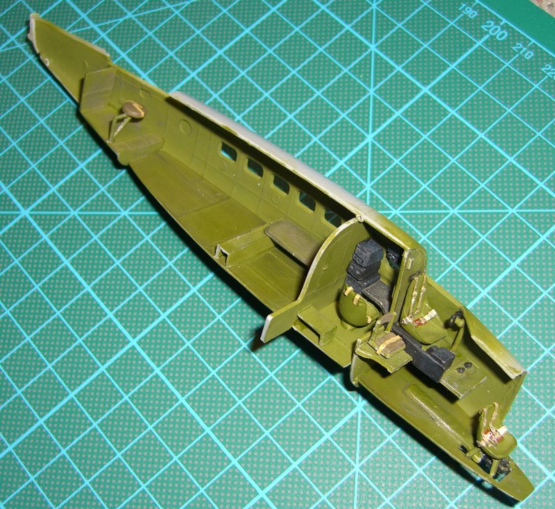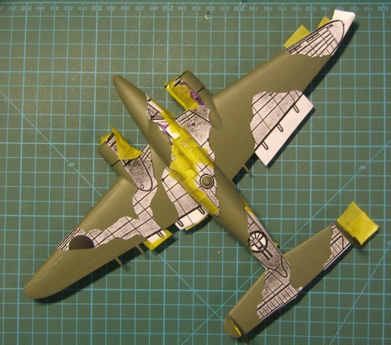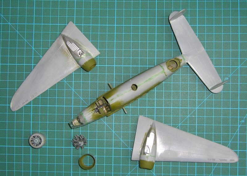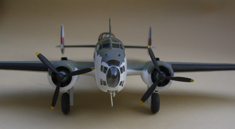 Bau: Hier habe ich entsprechend der Bauanleitung mit dem Cockpit begonnen und die Rumpfinnenseiten mit Humbrol 226 (Interior Green) grundiert. Nach dem Bemalen der Kleinteile mit dem Pinsel habe ich noch die Sitzgurte aus einem Set von Eduard ergänzt. Schon bei der ersten Baustufe merkte ich schnell, dass da nichts zueinander passt. Hier gilt es zu improvisieren, denn vernünftige Zeichnungen hatte ich nicht gefunden. Achtung wenn in Skizze 6 die Montage der Bugspitze ansteht, dann sollt diese an das Navigatordeck angepasst werden. Hier ist schlichtweg die Bauanleitung falsch. Die stumpfe Montage der Kabinenfenster habe ich mir erspart. Bei meiner Pembroke von Special hobby hatte ich erlebt, dass die Fenster nach dem Einbau noch Spannungsrisse bekamen! Immerhin kommt dieser Bausatz aus der gleichen Schmiede (MPM-Gruppe) und das Negativerlebnis wollte ich mir ersparen. Die restliche Inneneinrichtung kann lt. Bauanleitung montiert werden. Scheinbar sind die Farbangaben im Innern nicht unbedingt korrekt. Nur ist bei geschlossener Tür außer im Cockpit kaum was zu erkennen! Abweichend von der Bauanleitung öffnete ich das Loch für die Astrokuppel nach der Montage der beiden Rumpfhälften mittels passenden Bohrers. Da das Instrumentenbrett noch modifiziert (es ist falsch abgespritzt) werden muss und es sehr spät montiert wird, markierte ich diesen Schritt in meiner Bauanleitung. In Schritt 4 werden die beiden Tragflächen mit den Fahrwerksteilen montiert. Hier ist die Welt noch relativ in Ordnung. Im Schritt 5 erfolgte dann die Anpassung der Motorgondeln und des Leitwerks. Da tun sich Abgründe in Form von Spalten auf! Es folgt ein Grundkurs in Spachteln und Schleifen. Für die Montage der Motoren mit den Hauben gibt es keinerlei „Locations“. Hier hilft nur intensives Nachdenken und Probieren. Hierbei ist natürlich auch Schleifen angesagt, denn die Motore passen nicht in die Hauben. Die Zylinderköpfe müssen ein wenig abgeschliffen werden. Als nächstes erfolgte die Montage der Rumpfspitze, die außen aus drei Klarsichtteilen besteht. Tja, man denkt es schon. Richtig, sie passten nicht zu einander. Gründlich wurde hier geschliffen und poliert. Eine wichtige Hilfe war mir dabei das Micro-mesh Set (erhältlich bei Modellbaufarben.de). Es waren zwar hinterher die Strukturen für die Fenster weg, aber alles war wieder klar! Bei der Montage der Auspuffanlage zeigten sich deutliche Differenzen in der Passung. Die vorderen Teile gehen fließend ohne Kante (im Original ein Blechstoß) ineinander über. MPM/Italeri hat auch hier versagt. Teil 13 soll die Auspuffstutzen darstellen. Die Betonung liegt auf soll. Sie wurden durch kleine zurechtgeschnittene und gebogene Alurohre nach der Lackierung ersetzt. Im Turm habe ich mangels Unterlagen nichts ergänzt. Das Doppel-MG muss wirklich vor der Montage der beiden Klarsichtteile eingepasst werden. Es lässt sich später nicht mehr einbauen. Verklebt habe ich es ganz zum Schluss. Übrigens passen auch die beiden Turmteile nicht besonders gut zu einander. Vor der Lackierung wurden noch die Antennen montiert (Achtung Alternativteile!). Die Lufteinlässe hinter den Motoren passen nicht annähernd und gewisse Ähnlichkeiten mit dem Original sind rein zufällig. Ich hatte mangels Literatur nur eine Anpassung der Teile und ein Verspachteln durchgeführt. Die Cockpitverglasung passte recht gut.