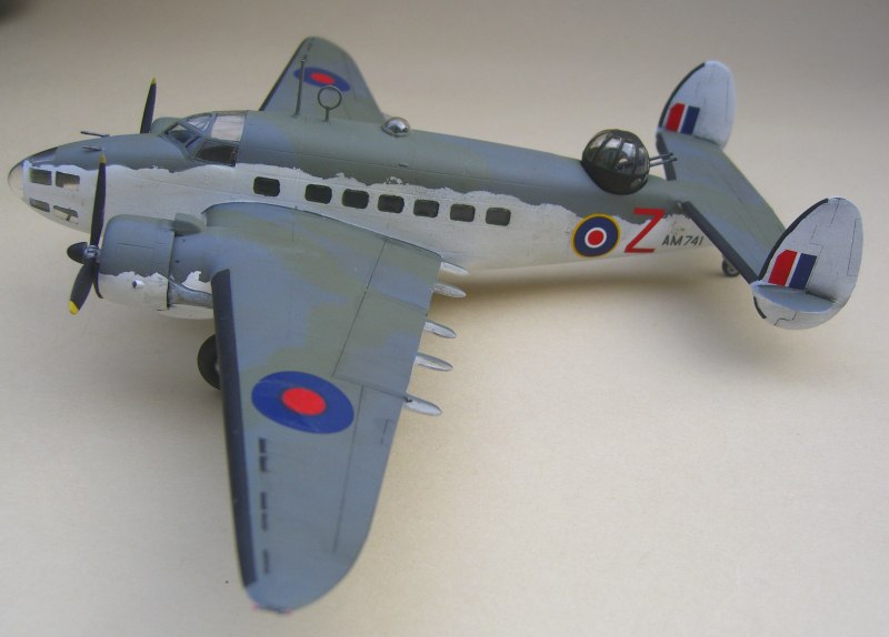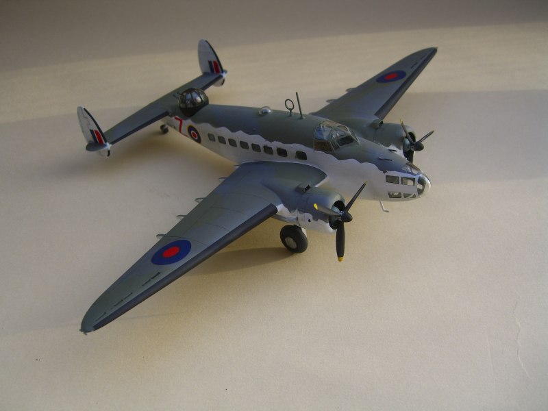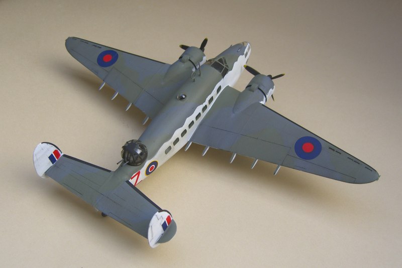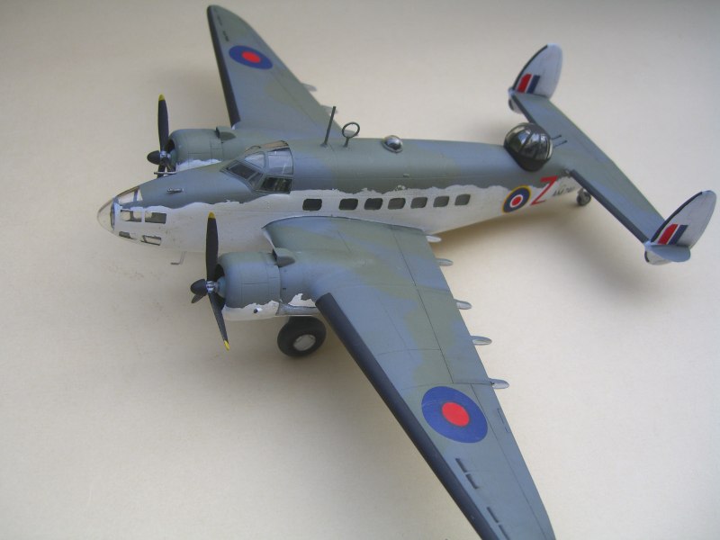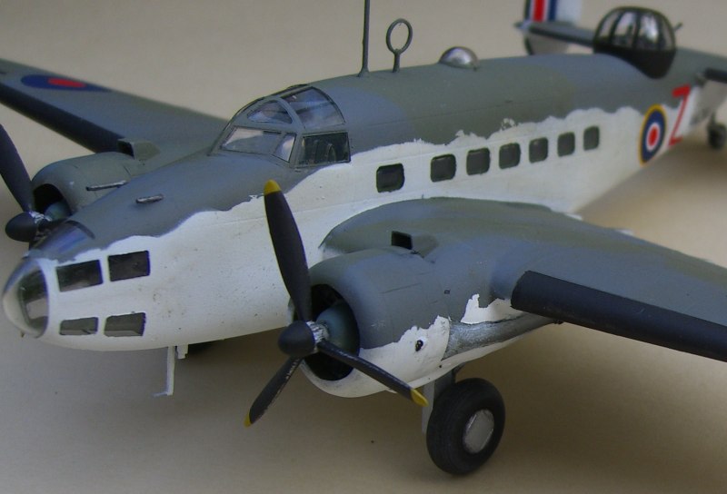 Es folgte der Part Lackierung! Zum Glück hatte Eduard ein Maskenset herausgebracht. Allerdings ist es nicht fehlerfrei. So ist bei mir das Fenster vor dem Cockpit auf dem Bug etwas zu groß geraten. Jedoch ohne das Set hätte ich ein echtes Problem beim Bug gehabt, denn die Struktur war ja wegpoliert… Durch das Eduard-Set konnte ich jedenfalls viel Zeit sparen. Die Kabinenfenster wurden mit Maskol von Humbrol verschlossen. Für die Fahrwerkschächte nutzte ich Teile eines alten Schwammes. Begonnen hatte ich dann in der Innenfarbe (Humbrol 226). Anschließend erfolgte eine Grundierung mit Hellgrau (hier Humbrol 64). Es folgte wieder ein Spachtel- und Schleifgang. Danach begann ich mit dem Außenanstrich. Der Heckturm, die äußeren Flügelnasen, die Höhenleitwerksnasen und die Vorderkanten des Seitenleitwerks wurden mattschwarz lackiert und anschließend abgeklebt. Übrigens schweigt sich die Bauanleitung zu diesem Thema völlig aus. Es gibt dort keinen schwarzen Turm oder irgendwelche Nasen… Es folgte unnötigerweise die Verkleidungen der Auspuffanlage mit Metallizer von Model Master. So hatte ich es beim Original in London-Hendon gesehen. Tatsächlich waren die Verkleidungen jedoch überlackiert und die Farbe löste sich im Laufe der Zeit durch die Hitzeentwicklung ab! Obwohl der untere Bereich meiner Hudson weiß sein sollte, begann ich mit einer dunkleren Oberseitenfarbe. Hier nutzte ich Model Master Dark Slate Grey und Dark Sea Grey. Die einzelnen Bereiche klebte ich mit dem hochkopierten und ausgeschnittenen Tarnmuster ab. Einzelne Bereiche klebte ich mit Maskol an. Nachdem das geschehen war, wurden mit Tamiya Klebeband und hochkopierten Tarnmuster die anderen Bereiche abgeklebt. Für die linke Seite lief es nicht so gut, denn hier verrutschte das Muster nach unten… Nach dem Entfernen der Masken hatte ich dann einen Anstrich, der dem der Bauanleitung ähnlich war. Es folgte das Aufbringen der Decals, die mit DACO Orange gefügig gemacht wurden. Die ganzen Kleinteile wurden auch montiert. Die Luftschrauben spritzte ich zuerst Gelb (Blattspitzen), dann Schwarz (restliches Blatt und Spinnerspitzen) und zum Schluss Silber (Verstelleinrichtung). Gealtert wurde das Modell dann mit Plakafarbe, die dann immer in Flugrichtung abgewischt wurde. Beim Weiß wurden einige Bereiche mittels Trockenmalmethode nachgearbeitet. Dann brachte ich die Bohrungen für die beiden Landescheinwerfer nach Gravur an und hinterlegte diese mit Chromfarbe. Da das Flugzeug danach immer noch zu trist aussah, folgte der behutsame Einsatz von Pigmenten in verschiedensten Farbtönen. Die etwas zu groß geratenen Abgasspuren entstanden wurden mittels Spritzpistole aufgebracht. Ich hatte dafür zwei Metallizer Töne gemixt. Es folgte die Versiegelung des Anstrichs mittels Humbrol Klarlack matt. Nachdem dieser endlich halbwegs trocken war, entfernte ich die Masken und die Fenster wurden mittels Cristal Clear dargestellt. Das ging ganz gut. Aus irgendwelchen Gründen glänzen sie nicht so wie erwartet… Dann wurden noch die exotischen Positionsleuchten an den Tragflächenspitzen ergänzt. Auf eine Verspannung mit Antennendrähten habe ich bewusst verzichtet, da meine Modelle doch von Ausstellung zu Ausstellung wandern sollen.