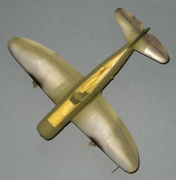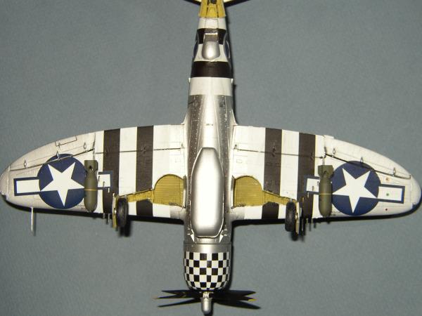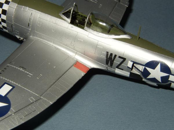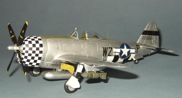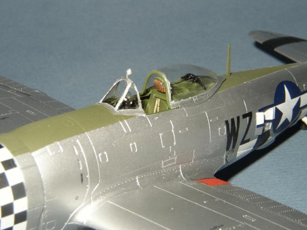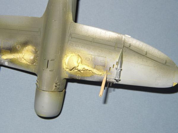 Für den Blendschutz nahm ich ein helles Olive (H86) (Schließlich flog die Maschine im Sommer und die Farbe war in nicht sehr Farbbeständig.) und für die Bomben dunkelte ich es mit H66 ab. Nachdem der Blendschutz abgeklebt wurde, folgte ein Anstrich der restlichen Maschine mit Silber (H11) und dann folgte wieder Metalizer in verschiedenen Schattierungen. Ein wenig poliert und anschließend versiegelt finde ich den Effekt für diesen Maßstab völlig ausreichend.