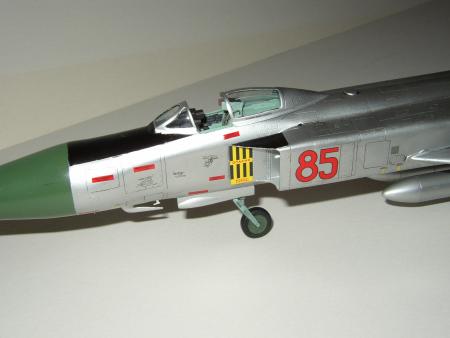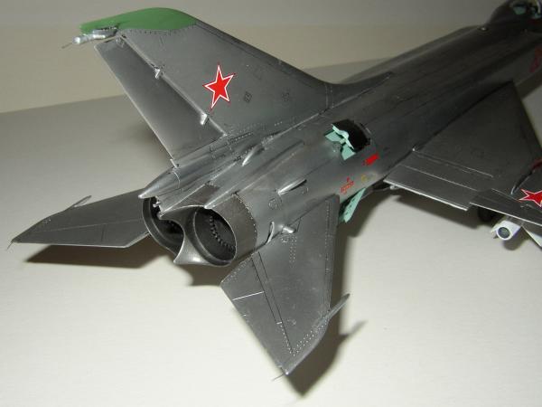 Beim Zusammenbau zeigten sich dann die Passprobleme. Das Alternativteil für den Cockpitausschnitt passte nur mäßig zum Rest. Die Gravuren waren auch leicht falsch. Spachtel kam an einigen weiteren Stellen (z.B. Bewaffnung, Zusatztanks, Grenzschichtzäune) zum Einsatz. Mehr als man erwartet. Nun Trumpeter hatte für unnötige Arbeit gesorgt. Die Triebwerksauslässe habe ich so aus der Kiste gebaut. Nur die zahlreichen Auswerfermarkierungen habe ich entfernt. Das reicht für den Zweck völlig aus. Bei den Bewaffnungsmöglichkeiten sollte man daran denken, dass es sich um eine Flagon A handelt. Die hatte nur die Aufhängungen unter den Grenzschichtzäunen. Ich hatte die anderen beiden Aufhängungen auch schon dran! Man sollte sich nicht immer auf die Bauanleitung verlassen.