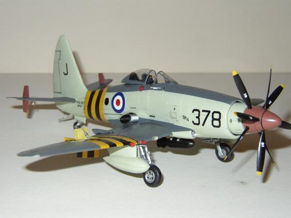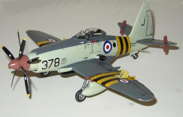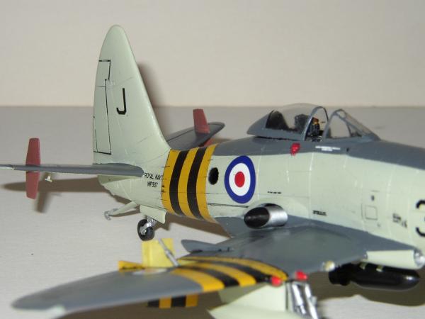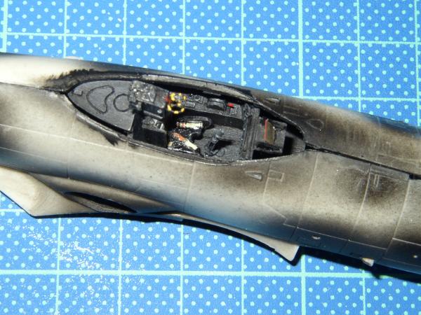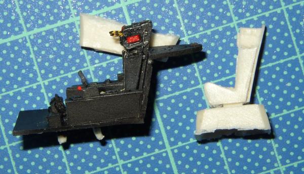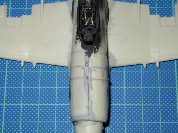 Bau: Ich begann mit der Kabine, die in einem aufgehellten Schwarz bemalt wurde. Der Schleudersitz wurde mit einem Martin Baker Mk. 2 von Aeroclub kombiniert. Die Konsolen wurden noch leicht nachdetailliert. Beim zusammenfügen der beiden Rumpfhälften zeigten sich Passprobleme. Die beiden Hälften wurden deshalb von hinten nach vorn verklebt. Einige Spalten verspachtelt und anschließend die Gravuren nachgezogen