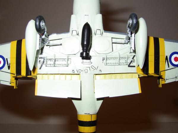 Grundiert habe ich, wie immer, mit Humbrol 64 und bei dieser Gelegenheit kamen auch gleich die rötlichen Teile dran, die dann abgeklebt wurden. Anschließend wurden die gelben Bereiche mit RLM 04 (xtracolor) gespritzt. Nach dem Abkleben folgte Extra Dark Sea Grey (xtracolor). Leider wollte dieser Farbton gar nicht decken und so wurde die Farbschicht leider zu stark. Anschließend folgte nach dem nochmaligen Abkleben mit Tamiya - Klebeband für den Farbauftrag von Sky (xtracolor). Die schwarzen Streifen stellte ich mittels Decals dar. Am Rumpfheck bereute ich diese Entscheidung, denn ein Streifen besteht aus sechs Einzelteilen!