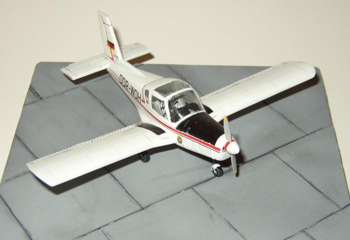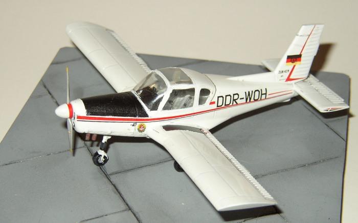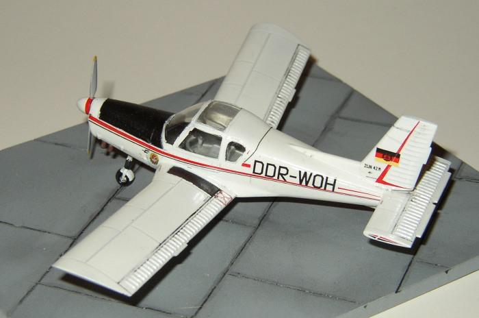 Schon 2005 hatte ich eine Zlin Z-42M für TOM Modellbau gebaut. Dieses Jahr wurde für die Spielwarenmesse erneut eine gewünscht. Also machte ich mich an die Arbeit. Der in China bei Trumpeter abgespritze Bausatz ist fast ein "Snap-Kit". Er besteht aus wenigen, jedoch gut zusammen passenden Einzelteilen. Ärgerlich fand ich nur, dass auf dem Decalbogen kein Instrumentenbrett und keine Gurte vorhanden waren. Sie beleben das gut einsehbare Cockpit ungemein.