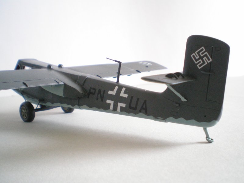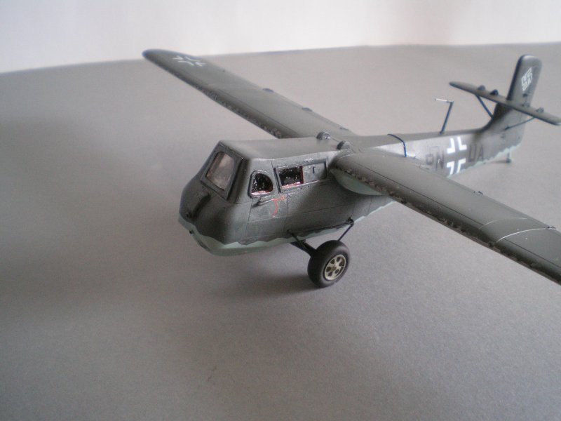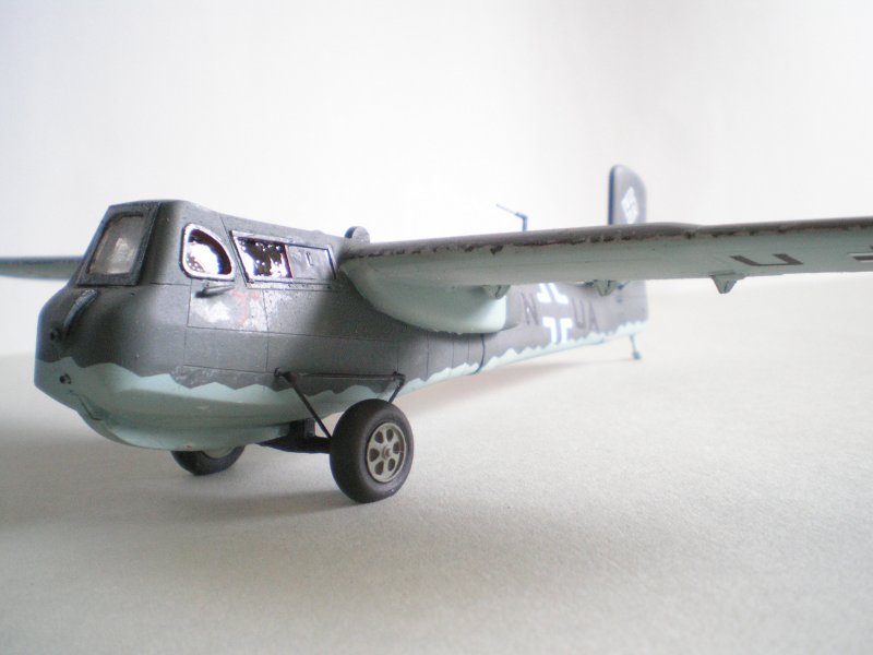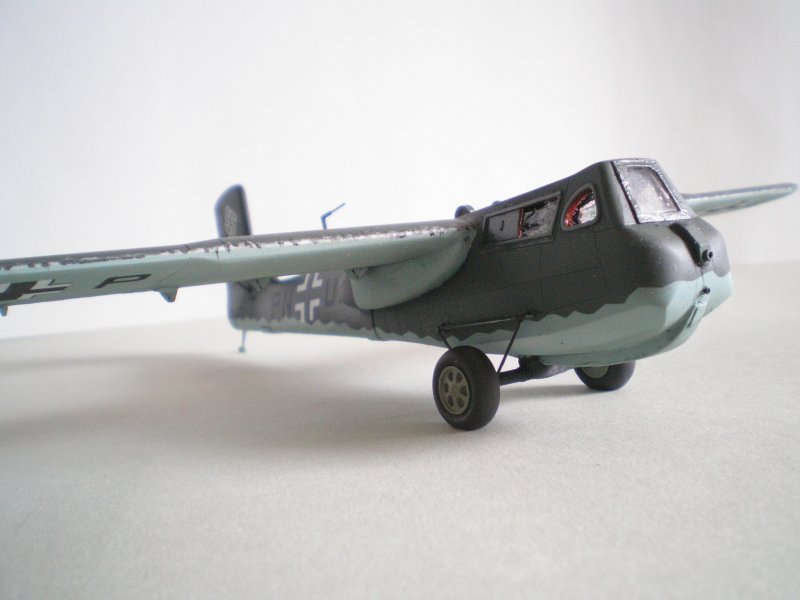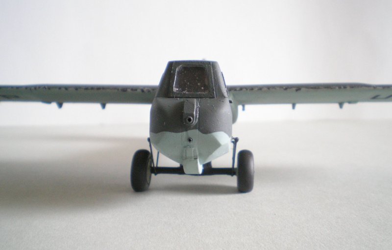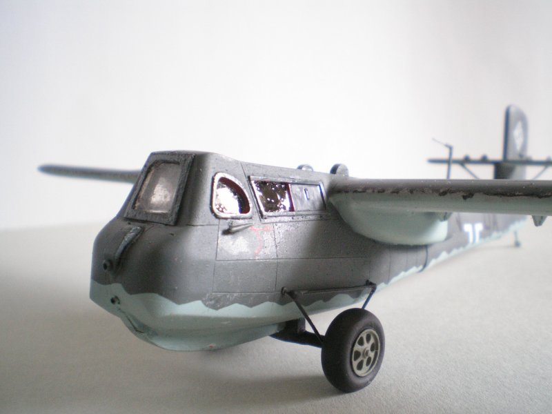 Der fast blasenfreie Bausatz lässt sich gut bauen, bis auf die Spalten, die sich beim Ausrichten der Flügel auftun. Nix für sparsame, da passt ordentlich was rein. Das Cockpit ist spartanisch, aber das macht nix, denn durch die Resinscheiben ist eh nicht mehr viel zu sehen. Ich selber verwendete nur die Frontscheibe und zog von innen über die Seiten eine Schicht CLEAR-FIX. Auch die Bauteile Nr.10 ließ ich weg und ersetzte diese durch Kanülen, was dem Deckelbild näher kommt und auch eine kleine Erleichterung ist, wenn man aus Draht( der nicht beiliegt) das Gestell für den Rollwagen erstellt.